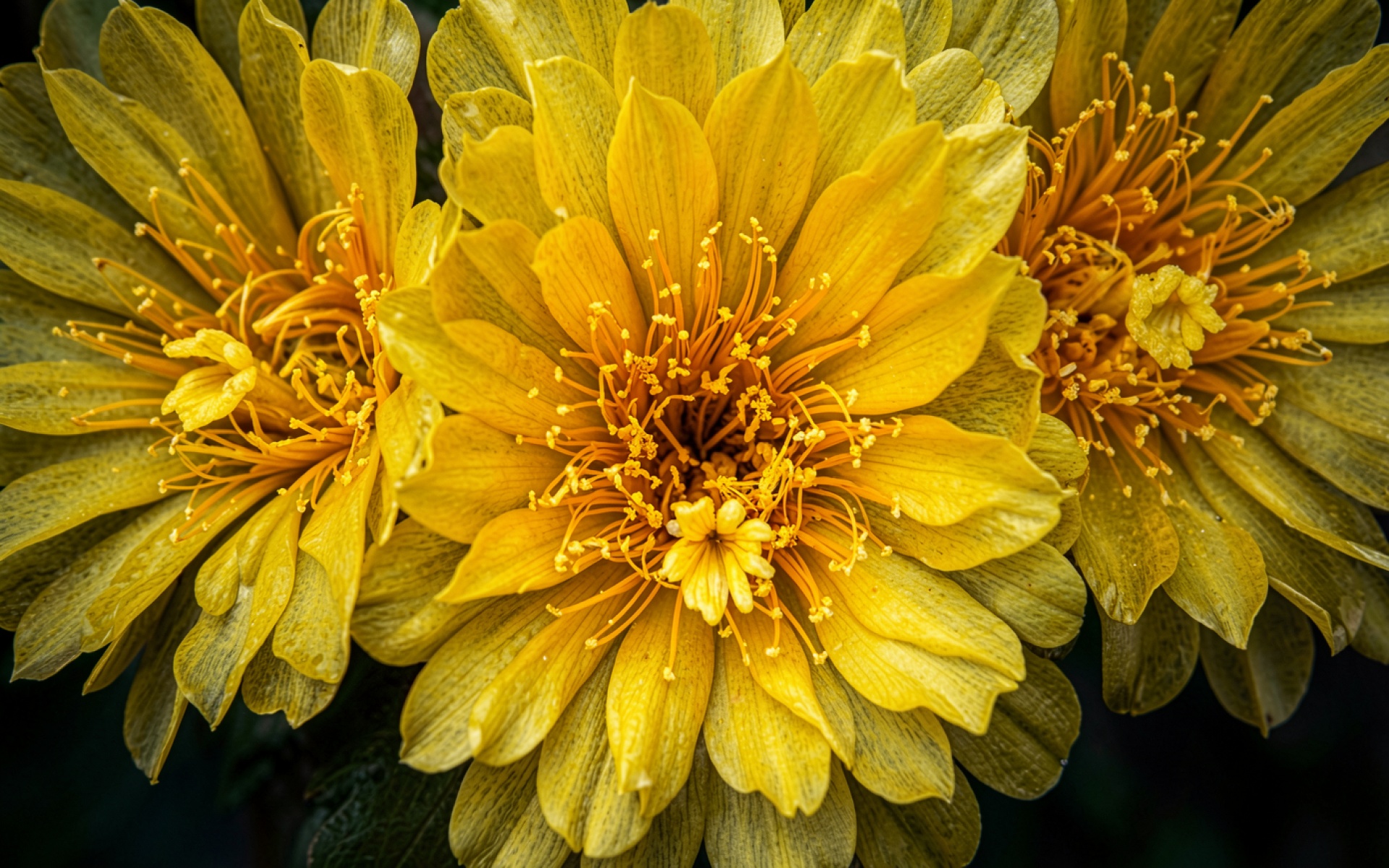 Изображение детально передает текстуру лепестков с выраженными прожилками и ворсинки тычинок в центре каждого цветка. Контрастное освещение создает глубокие тени между слоями лепестков, подчеркивая объем и насыщенность желтого пигмента. Плавные переходы темного фона исключают визуальный шум, позволяя сфокусироваться на центральных объектах. Перед загрузкой доступен удобный предпросмотр для оценки качества отображения на вашем экране.