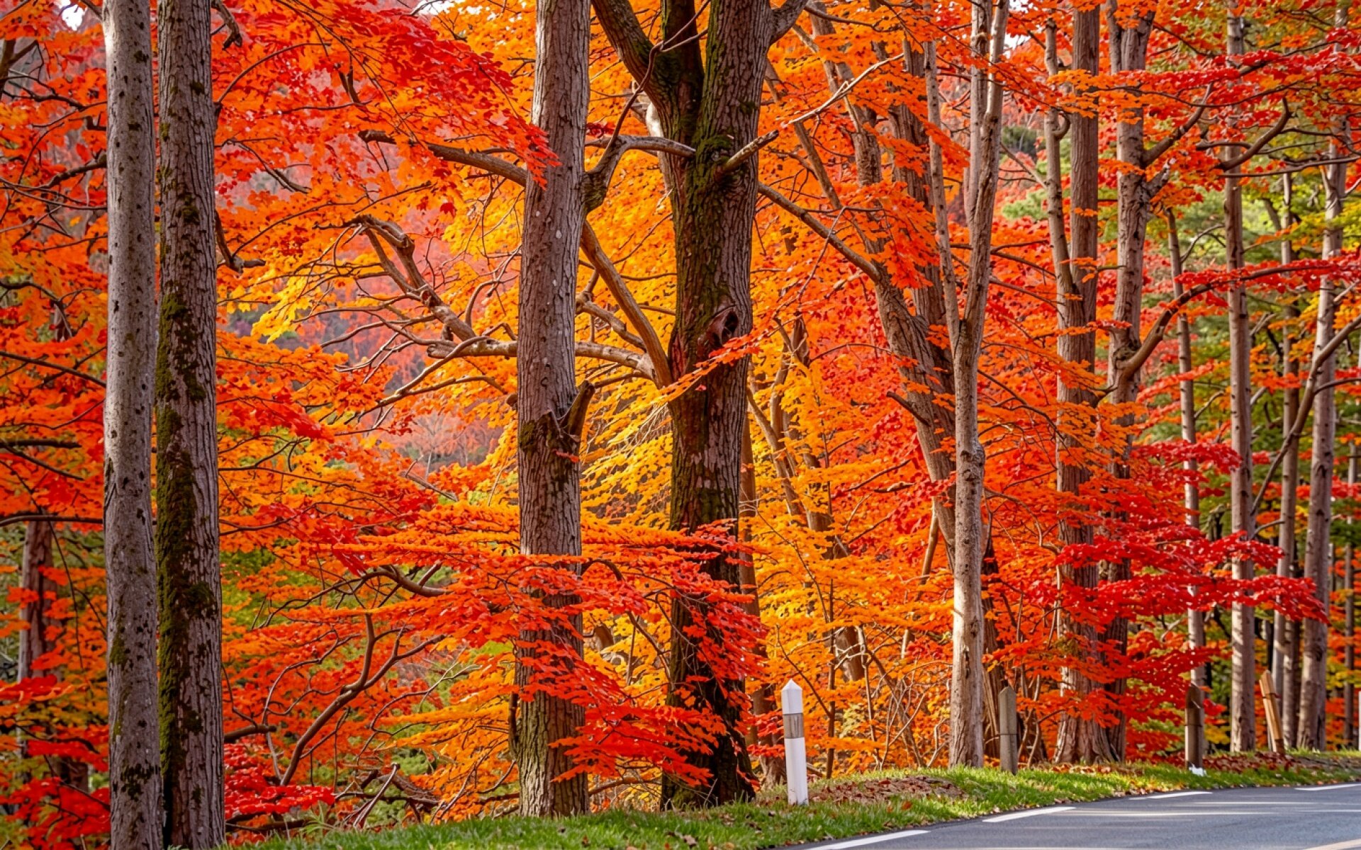 Доступны для скачивания JPG обои Осенний лес с красными кленами вдоль дороги. Почему стоит скачать их? Альтернативы сильнее сжимают изображение, но мы предоставляем оригинал.