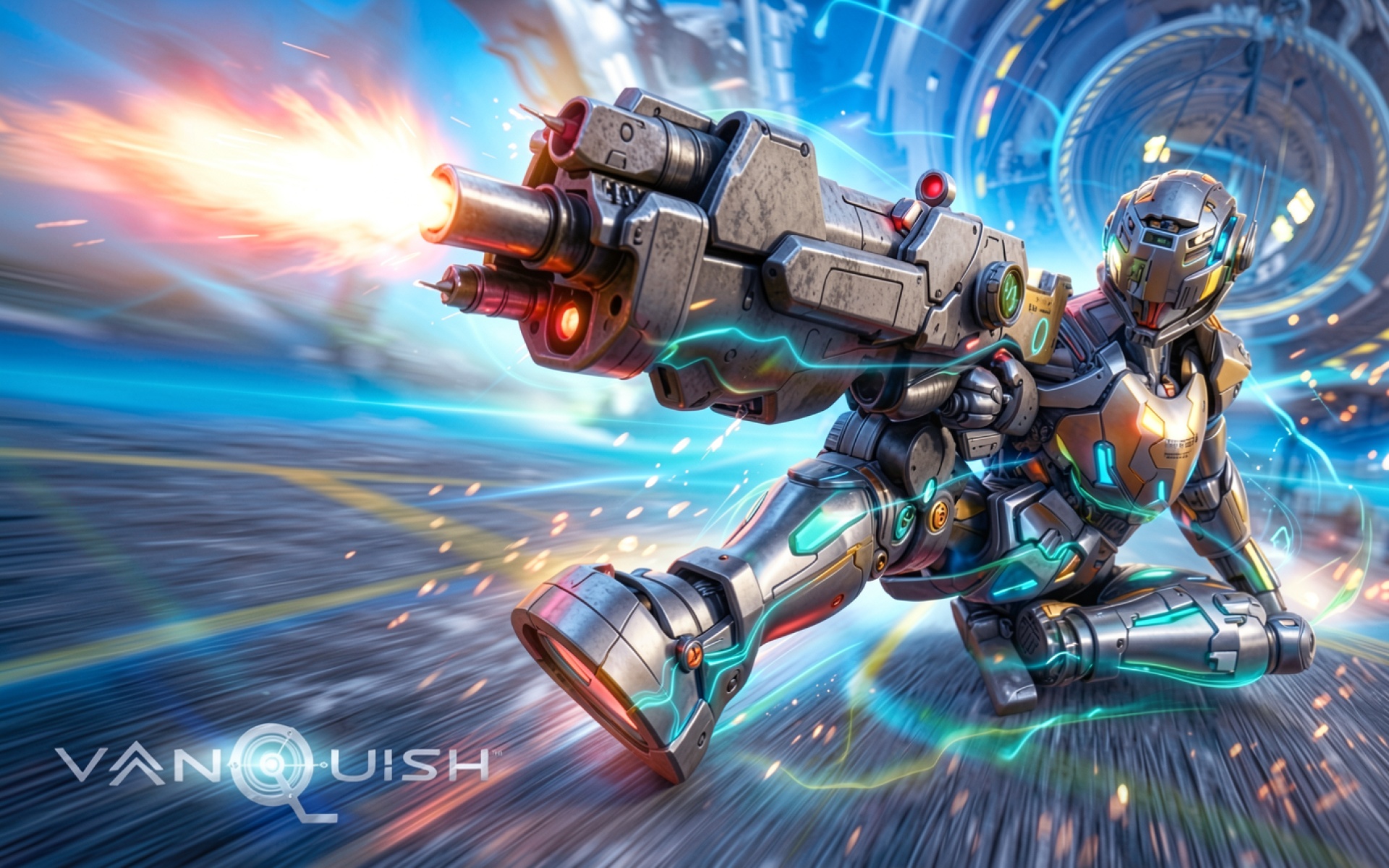 Изображение детально передает текстуру полированного металла и композитных материалов экзоскелета. Освещение характеризуется резкими контрастами между холодным неоновым свечением синих линий и яркой вспышкой выстрела из ствола оружия. Градиенты фона плавно переходят от глубокого синего к светло-голубому, подчеркивая динамику движения. На сайте доступен удобный предпросмотр перед загрузкой для оценки качества на экране.