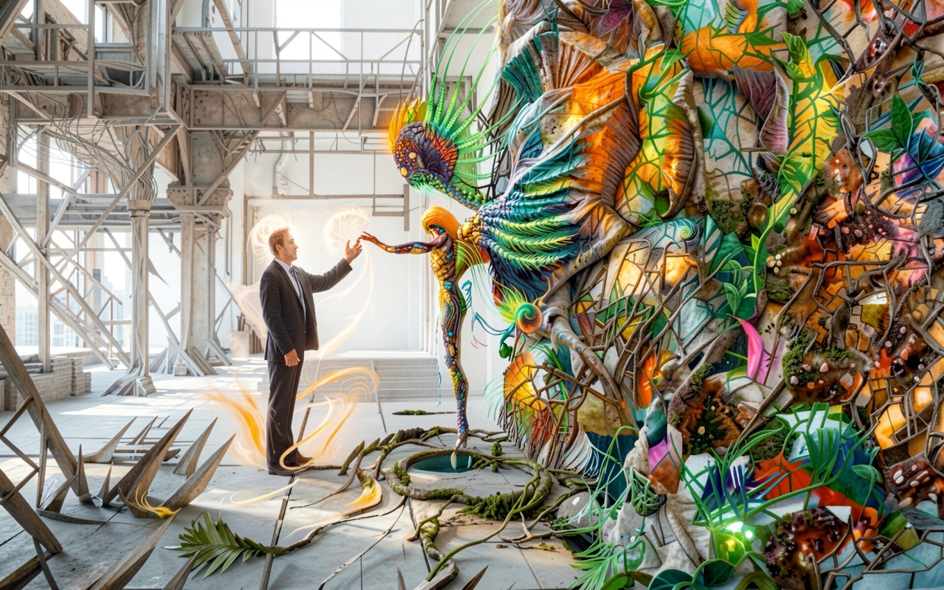 Изображение отличается сложной проработкой текстур органических форм и строгих линий архитектуры. Контрастное освещение создает четкие блики на костюме мужчины и глубокие тени в складках сюрреалистичного облика женщины. Градиенты фона плавно переходят от холодного белого света из окон к насыщенным спектрам растительных элементов. На сайте доступен удобный предпросмотр перед скачиванием, чтобы оценить качество отображения на экране.