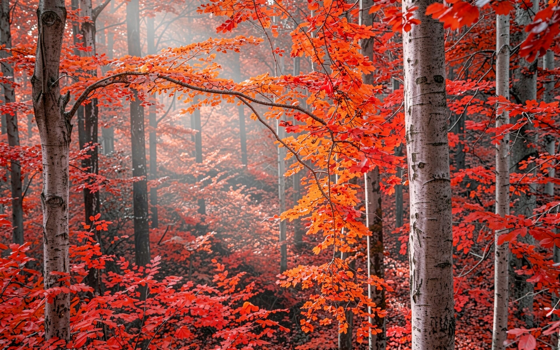 Изображение характеризуется высокой детализацией текстуры коры деревьев и четкостью прожилок каждого листа. Мягкий рассеянный свет создает плавные градиенты в глубине кадра, где туман сглаживает контрасты между передним и задним планом. Акценты расставлены на насыщенных красных тонах листвы, которые контрастируют с холодными серыми оттенками стволов. На сайте доступен удобный предпросмотр перед скачиванием для оценки качества на экране.