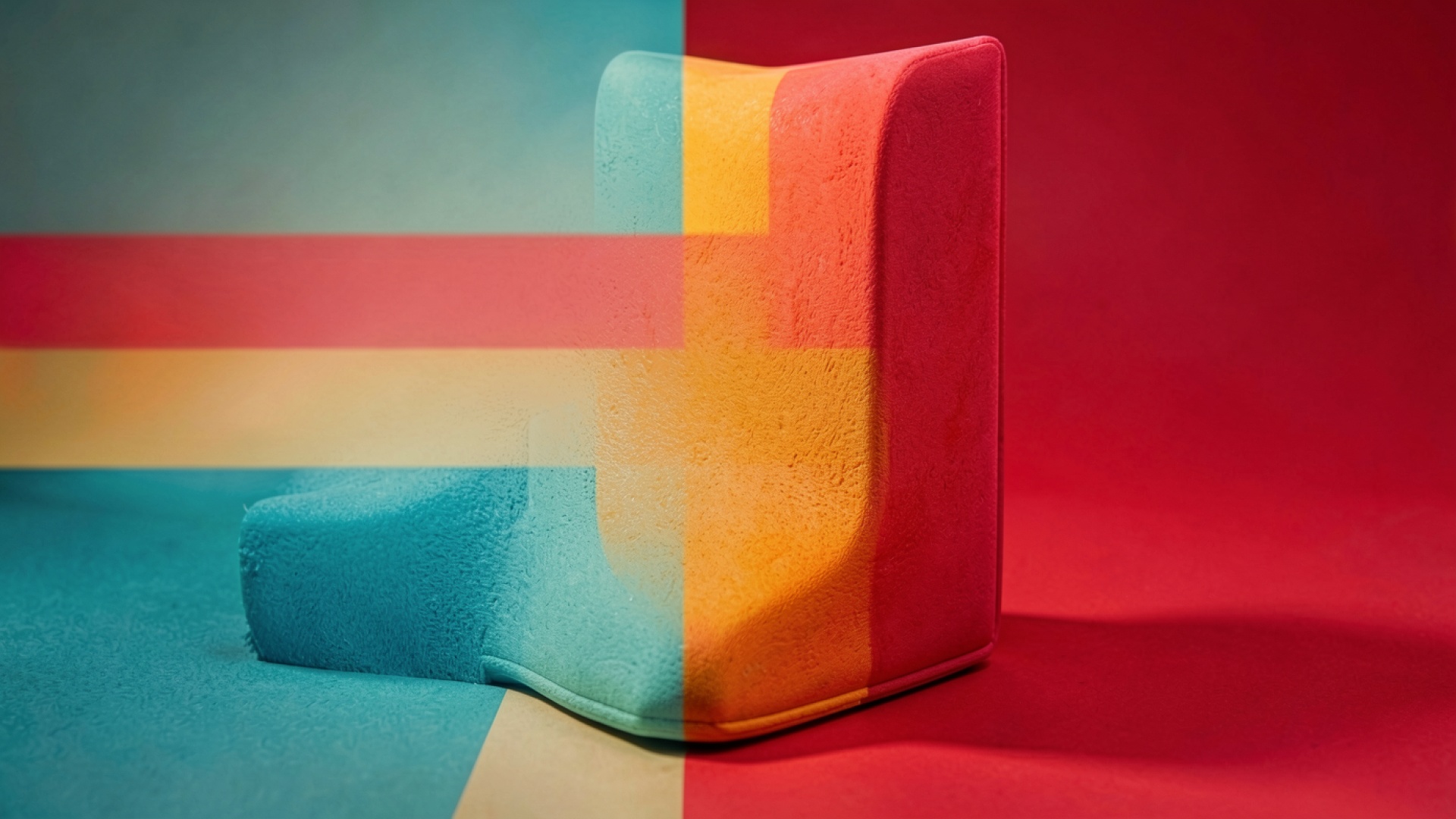 <Изображение характеризуется выраженной зернистой текстурой поверхности объекта, которая создает тактильный эффект. Освещение распределено неравномерно, что подчеркивает объем формы через мягкие переходы теней и четкие световые акценты на гранях. Цветовые градиенты фона плавно перетекают из бирюзового в насыщенный красный, создавая динамический контраст с центральным элементом. На сайте доступен удобный предпросмотр перед загрузкой для оценки качества отображения на экране.