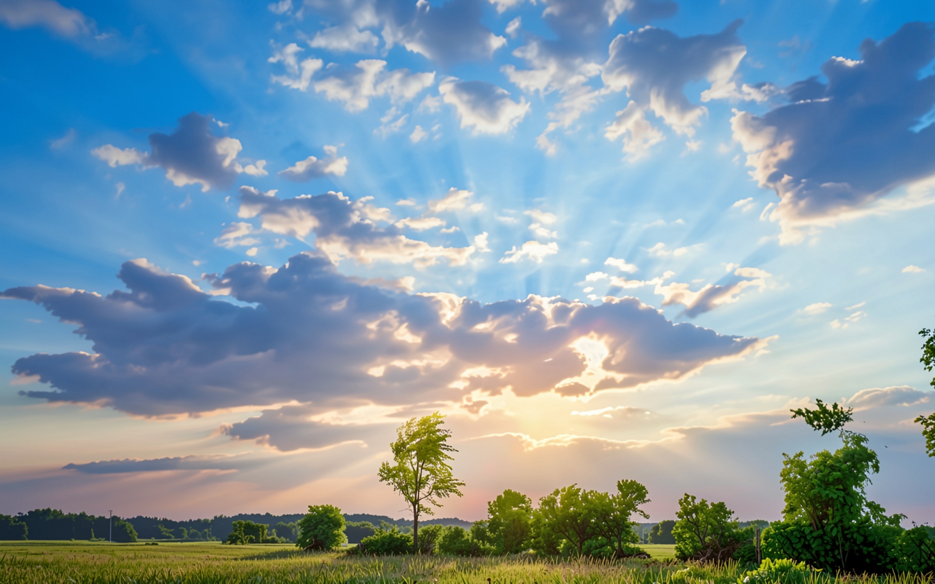 Изображение характеризуется высокой детализацией листвы центрального дерева и мягкими градиентами голубого неба. Контрастные световые акценты создают эффект объемных лучей, пробивающихся сквозь кучевые облака. Текстуры травы на переднем плане переданы с учетом естественного освещения, а глубокие тени в кронах кустарников добавляют сцене глубины. На сайте доступен удобный предпросмотр перед загрузкой для оценки качества на экране.
