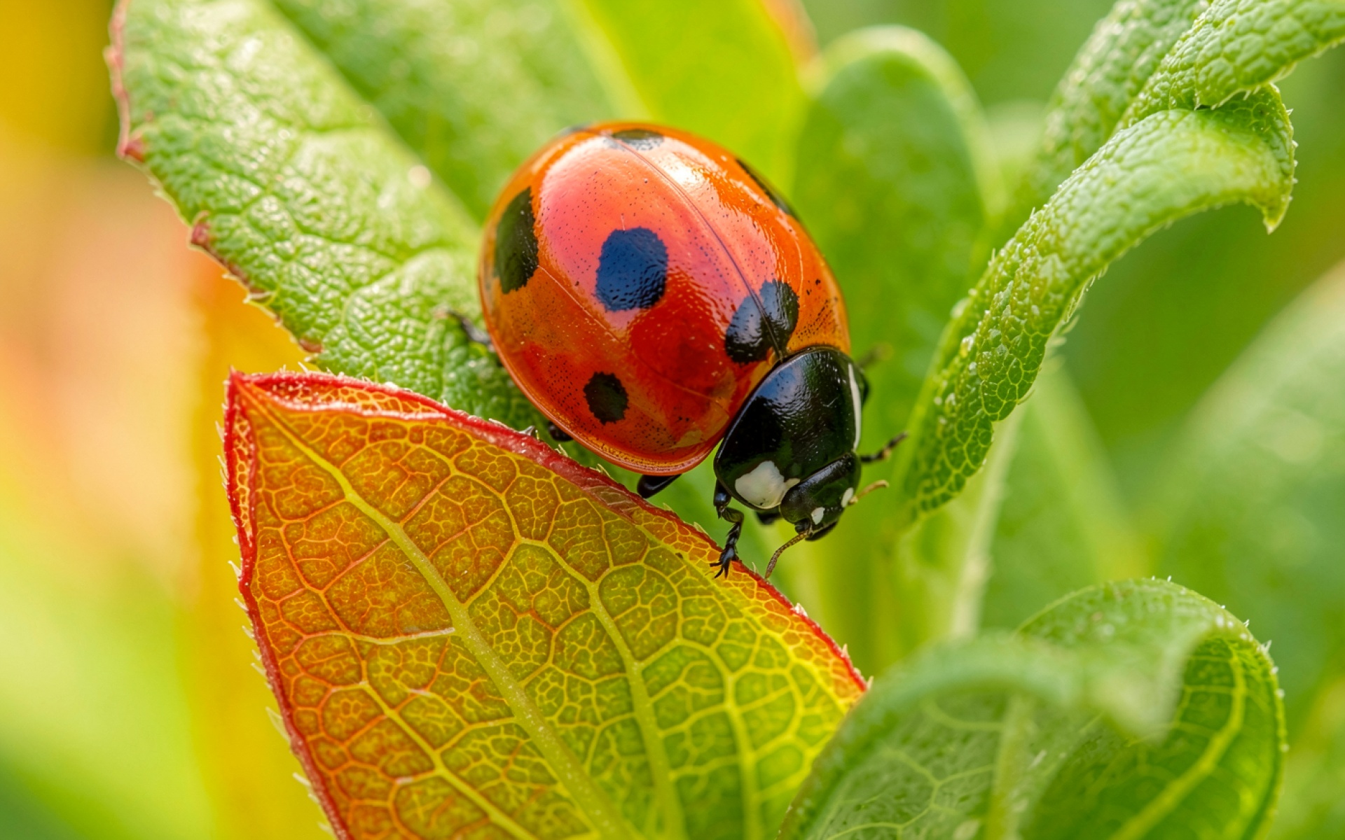 Изображение детально передает глянцевую текстуру надкрылий жука с четкими темными пятнами. Освещение создает мягкие блики на поверхности панциря, подчеркивая его объем и сферическую форму. Фон представляет собой градиент из насыщенных зеленых и желтых оттенков с выраженным размытием, что акцентирует внимание на прожилках листа. Сайт предоставляет удобный предпросмотр перед скачиванием для оценки качества на экране.