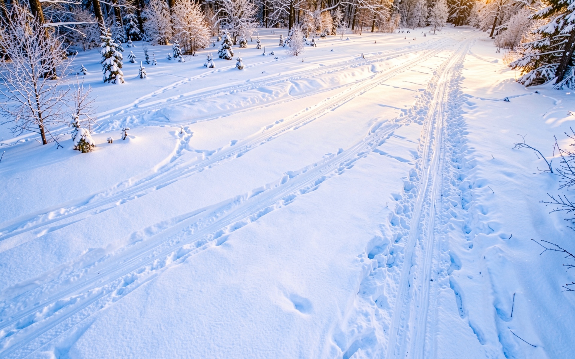 Изображение передает детальную текстуру свежевыпавшего снега с выраженными кристаллическими гранями. Освещение характеризуется мягким золотистым градиентом на горизонте и глубокими синими тенями в колеях лыжни. Контраст между яркими бликами солнца и холодными участками леса создает объемную композицию. Перед загрузкой на сайте доступен удобный предпросмотр для оценки качества отображения всех элементов сцены на вашем экране.