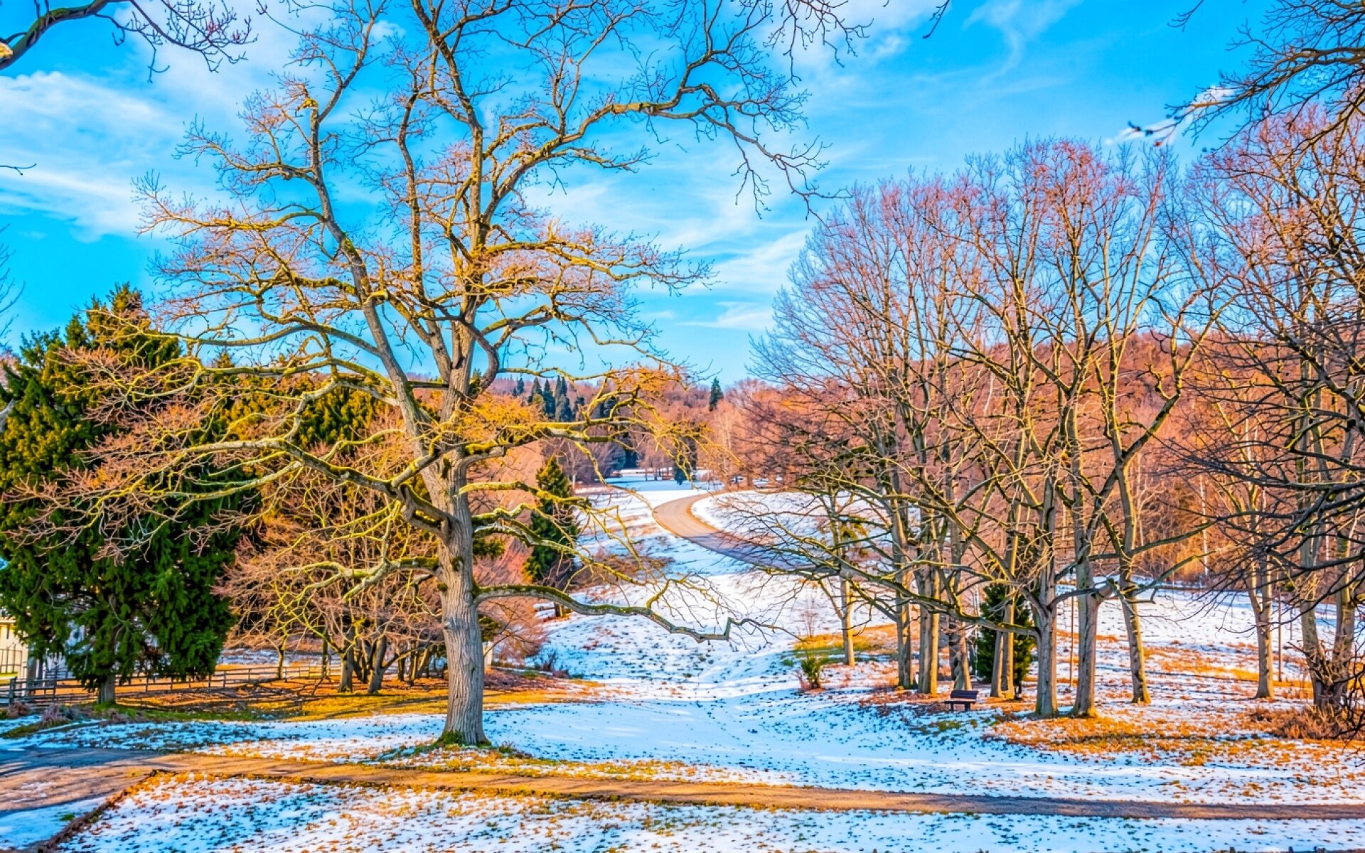 Скачайте JPG файл обоев Зимний парк с голыми деревьями и снегом на нашем сайте – и вот причина: здесь нет полос градиента из-за низкого битрейта.