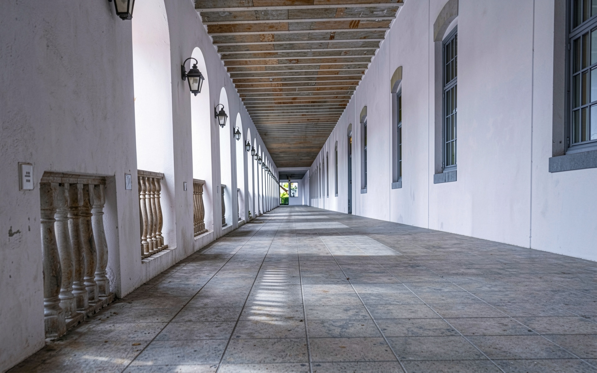 Эта фотография архитектурного пространства идеально подходит для создания минималистичного фона рабочего стола или использования в дизайн-проектах. Композиция построена на строгой линейной перспективе, где ритм белых стен и повторяющихся арочных проемов создает ощущение глубины и порядка.