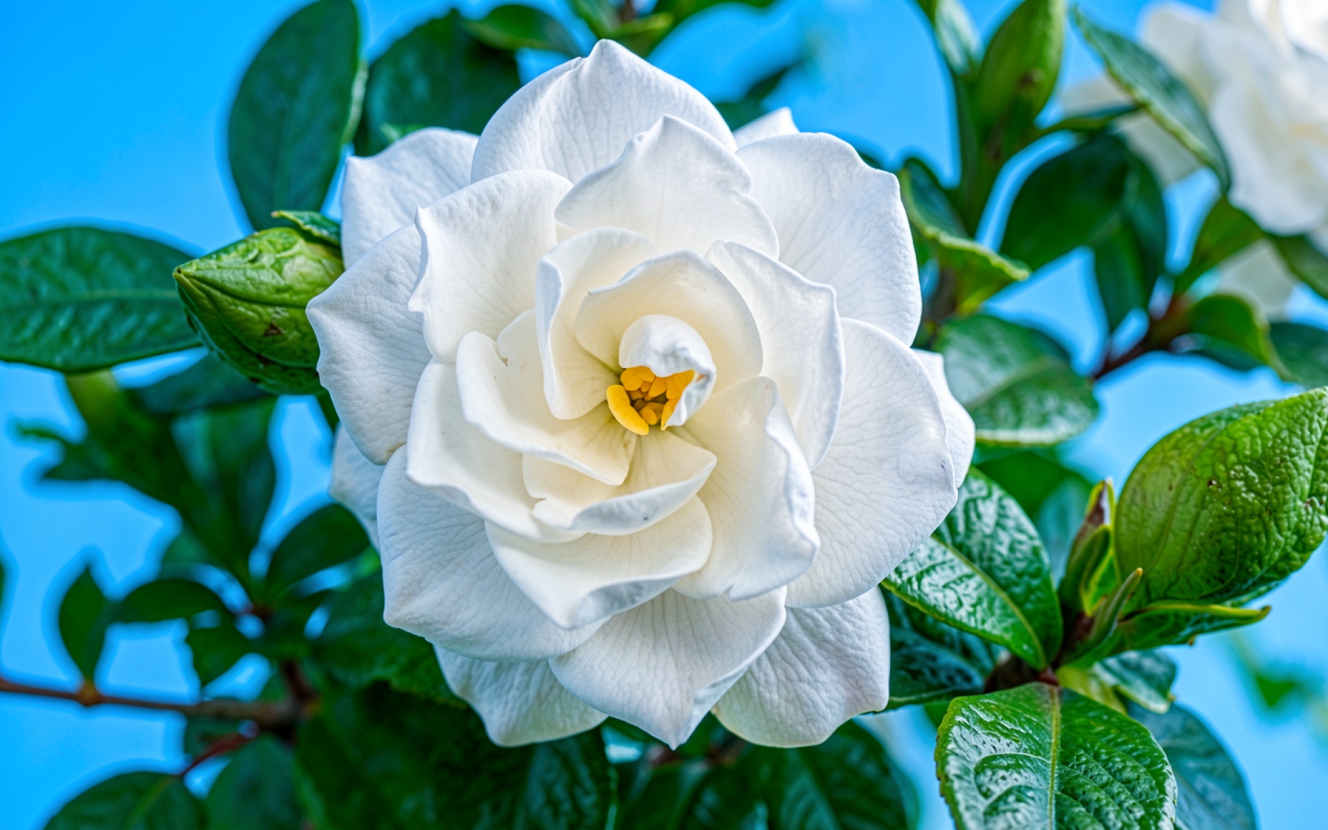 Скачайте JPG файл обоев Белый цветок камелии на фоне синего неба на нашем сайте – и вот почему: файл оптимизирован для установки на рабочий стол и экран телефона.