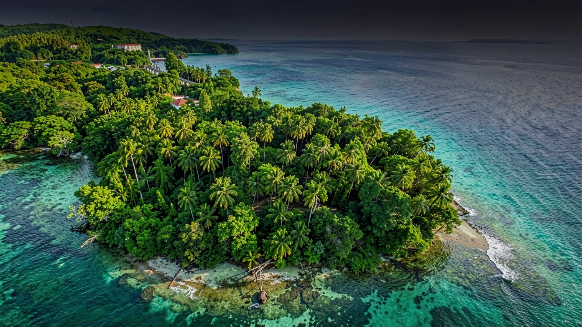 Изображение детально передает текстуру пальмовых листьев и градиенты морской воды от светло-бирюзового до глубокого синего. Освещение создает четкие блики на поверхности океана и мягкие тени внутри густой растительности острова. Контраст между темным небом и яркой зеленью подчеркивает объем ландшафта. На сайте доступен удобный предпросмотр перед скачиванием для оценки качества на экране.