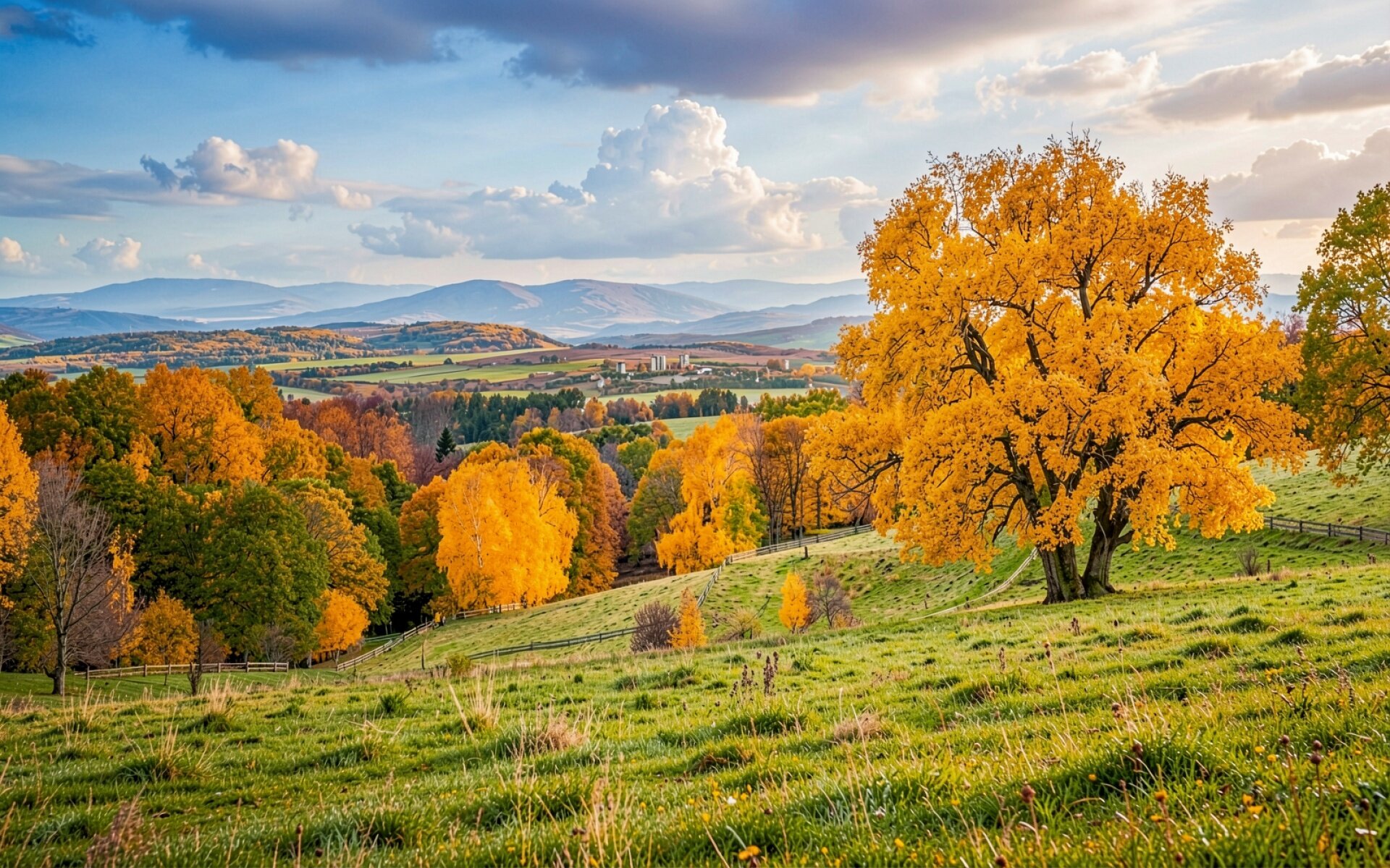 Композиция построена на правиле третей, где доминирующее дерево в правой части кадра создает визуальный баланс с панорамным видом долины. Цветовая гамма базируется на комплементарных цветах: золотисто-оранжевом и глубоком синем, что усиливает восприятие глубины пространства. Технически изображение характеризуется высокой четкостью текстур травы на переднем плане и плавным градиентом неба с кучевыми облаками. Согласно данным color-hex.com, подобные сочетания теплых и холодных тонов используются в дизайне для создания ощущения гармонии и стабильности.