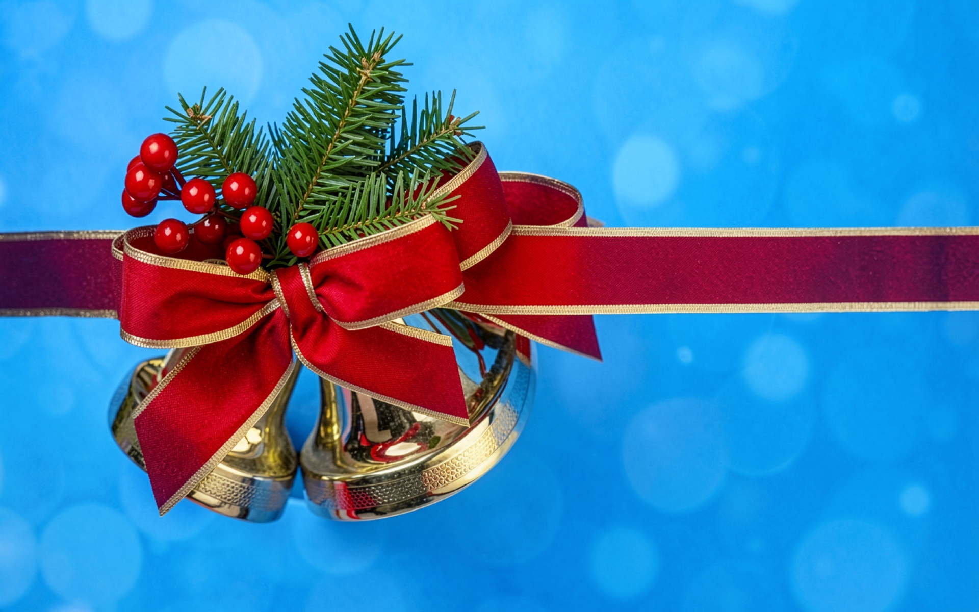 Золотые рождественские колокольчики с красным бантом обои