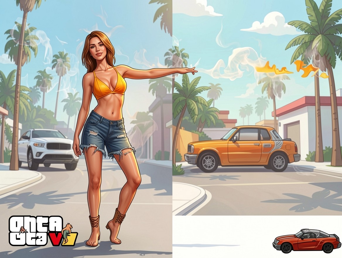 Изображение отличается детальной проработкой текстуры денима и матовой поверхностью ткани топа. Освещение имитирует яркий полуденный свет, создавая четкие контрастные тени на асфальте и мягкие блики на коже. Градиенты неба плавно переходят от насыщенного голубого к светлому горизонту, а передний план дополнен четкими контурами тропической растительности. На сайте доступен удобный предпросмотр перед загрузкой для оценки качества отображения на вашем экране.