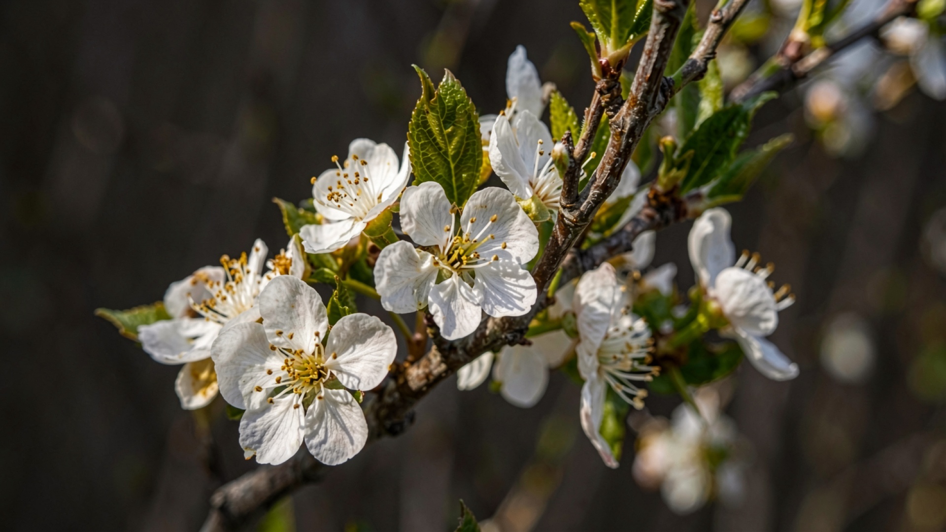 Белые цветы вишни на темном фоне обои