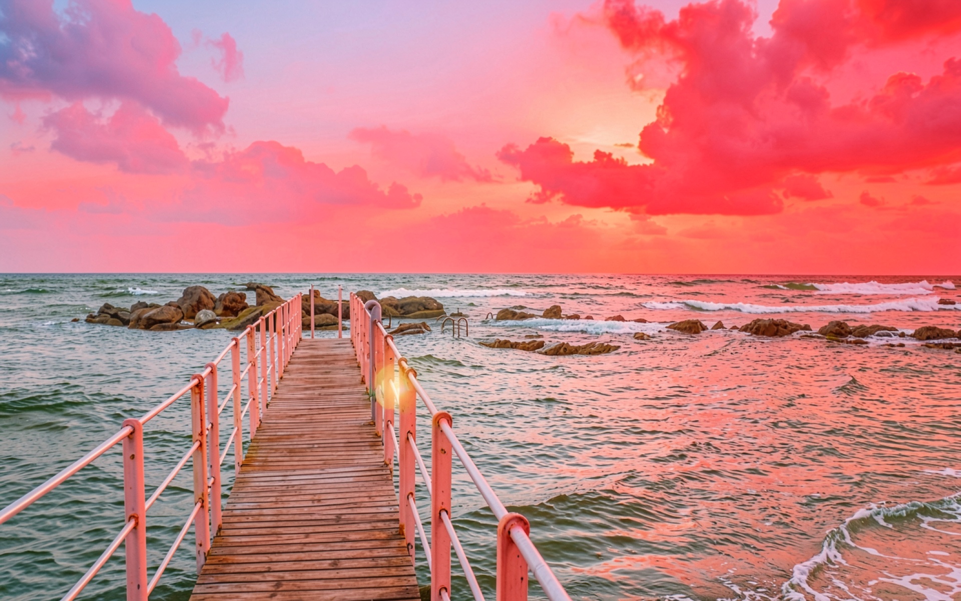 Изображение детально передает текстуру старого дерева и металлических перил, которые отражают мягкий свет уходящего солнца. Градиенты неба переходят от насыщенного розового к глубокому красному в области облаков, создавая выразительный контраст с бирюзовыми оттенками морской воды. Освещение подчеркивает пенные гребни волн и острые грани прибрежных скал, а тени ложатся мягко, создавая объемную композицию. На сайте доступен удобный предпросмотр перед скачиванием для оценки качества на экране.