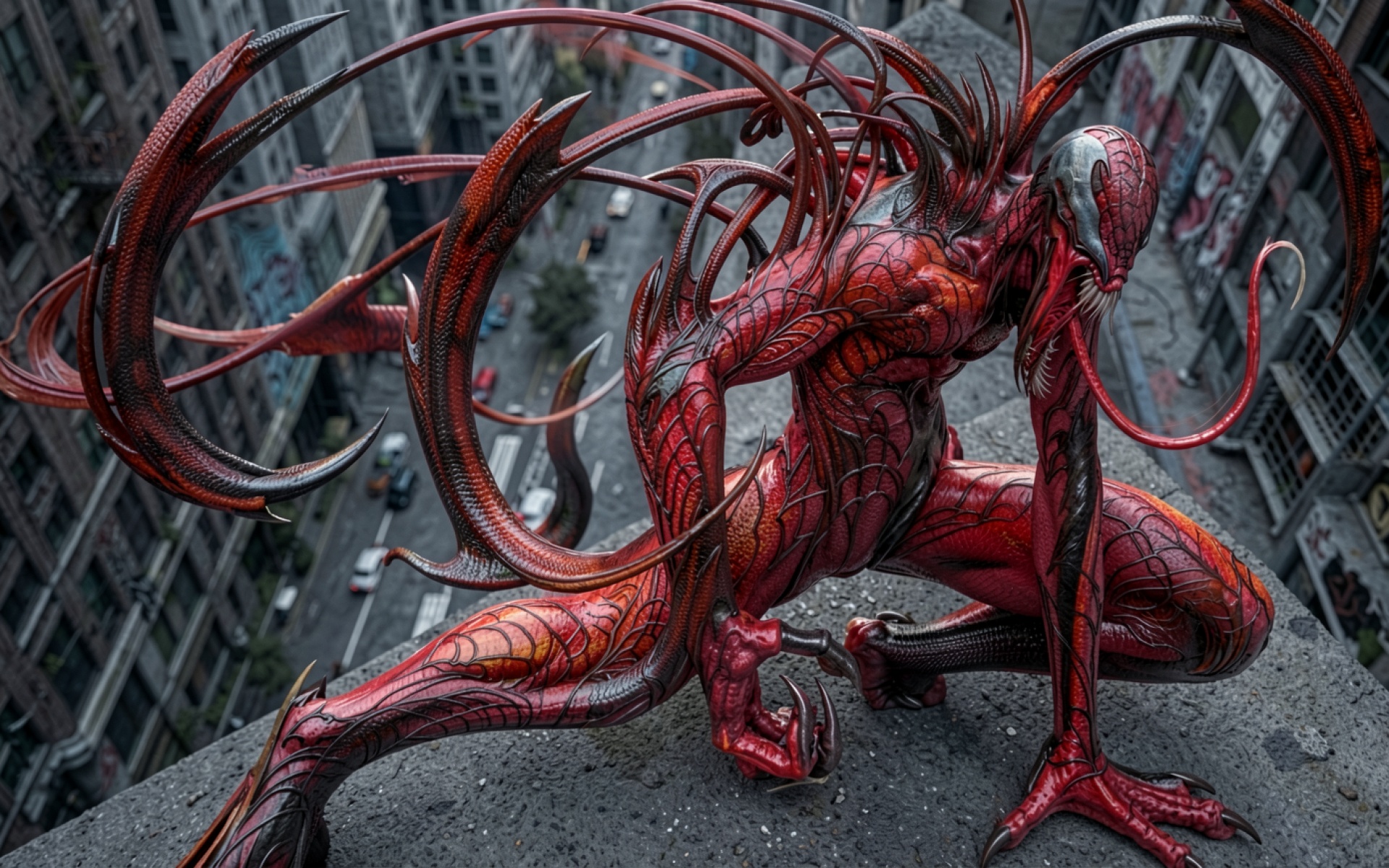 Скачайте JPG файл обоев Карнаж красный симбиот на крыше города на нашем сайте – и вот причина: изображение прошло минимальное сжатие, что позволило сохранить все мелкие детали