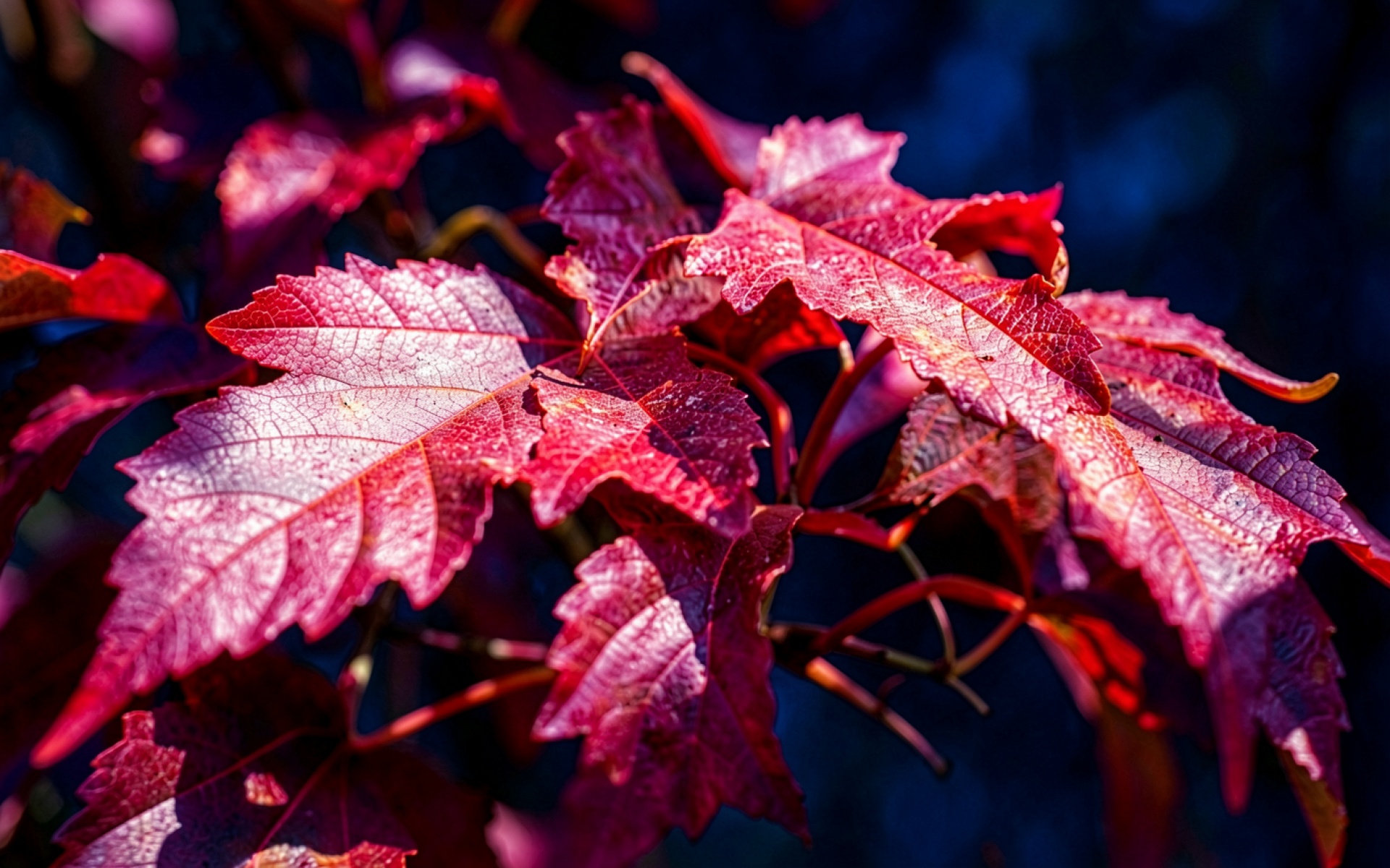 Красные осенние листья винограда в темном лесу обои