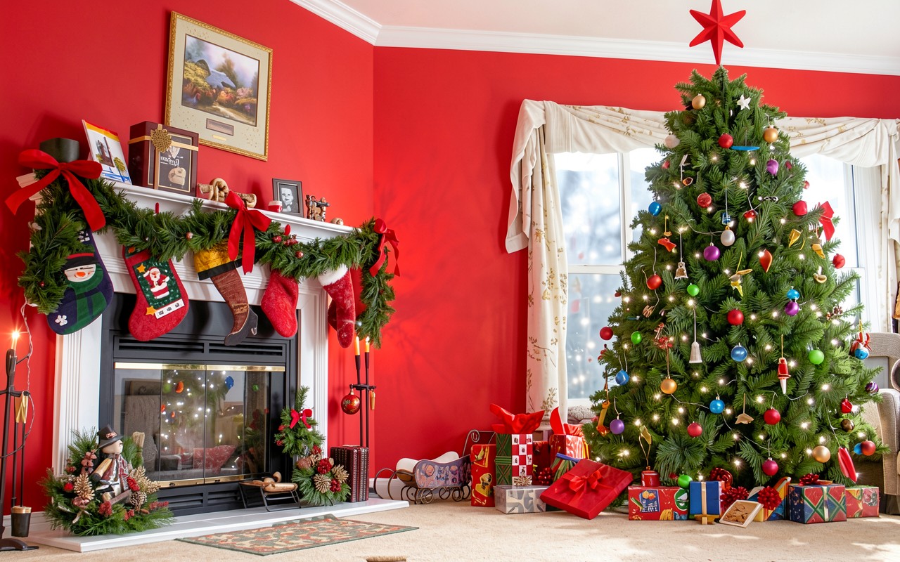 Композиция построена на контрасте насыщенного красного цвета стен и глубокого зеленого оттенка хвои норвежской ели. В центре внимания находится камин с классическим белым порталом, украшенный хвойной гирляндой и традиционными рождественскими носками. Освещение имитирует мягкий дневной свет из окна, что подчеркивает текстуру подарочной упаковки и глянцевый блеск елочных шаров. Согласно стандартам цветопсихологии на color-science.com, сочетание красного и зеленого вызывает сильные ассоциации с традиционным праздником и уютом.