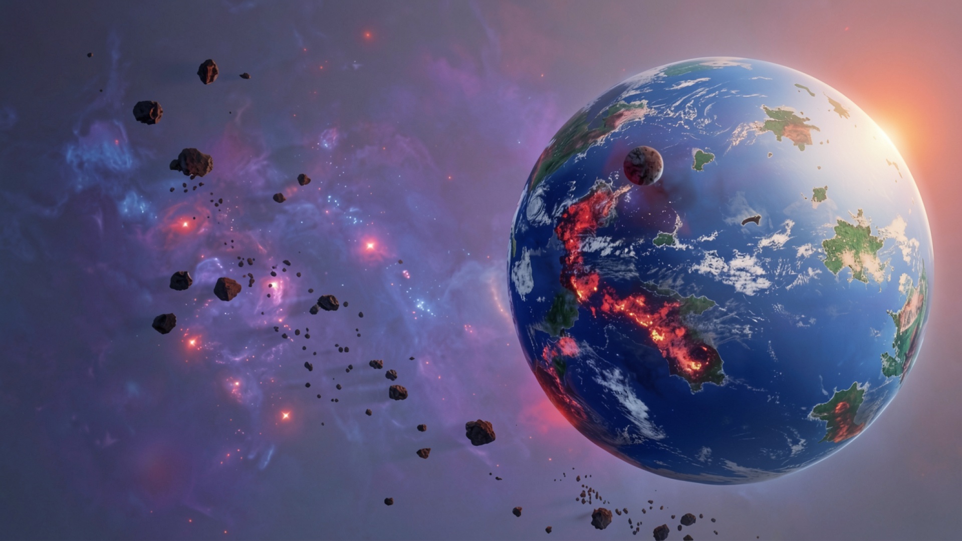 Изображение детально передает текстуру раскаленной магмы, проступающей сквозь разломы земной коры. Контрастное освещение создает резкие переходы между холодными синими оттенками океанов и ярко-оранжевыми всполохами огня. Мягкий градиент космического фона с вкраплениями звезд подчеркивает объем планеты и мелких обломков астероидов. На сайте доступен удобный предпросмотр перед скачиванием, чтобы оценить качество отображения теней и бликов на вашем экране.