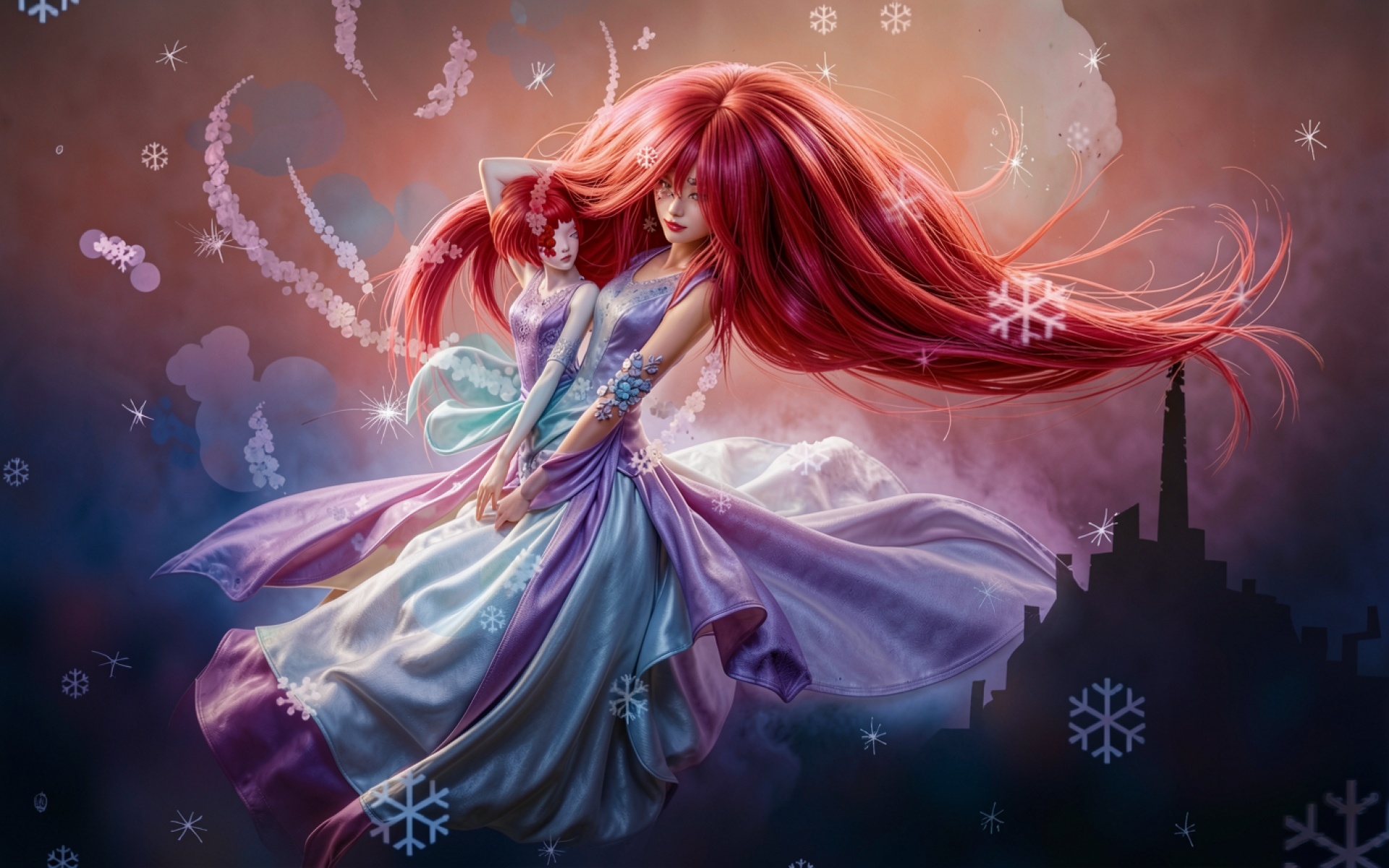 Изображение отличается детальной проработкой текстуры шелка и атласа в складках платья. Освещение создает мягкие блики на поверхности ткани и подчеркивает насыщенный красный пигмент волос. Градиенты фона плавно переходят от глубокого синего к приглушенным розовым тонам, создавая объемную композицию с четкими тенями. На сайте доступен удобный предпросмотр перед скачиванием для оценки качества на экране.
