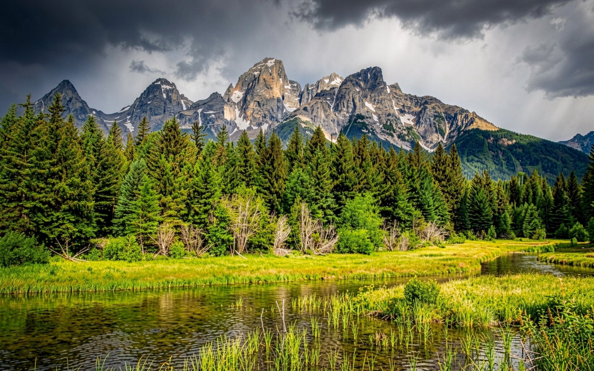 Изображение детально передает текстуру скалистых пиков и густую зелень хвойных деревьев. Освещение создает выразительный контраст между темным грозовым небом и ярко-зелеными лугами, подчеркивая глубину теней в лесной зоне и мягкие градиенты на поверхности воды. Сайт предоставляет удобный предпросмотр перед загрузкой для оценки качества на экране.