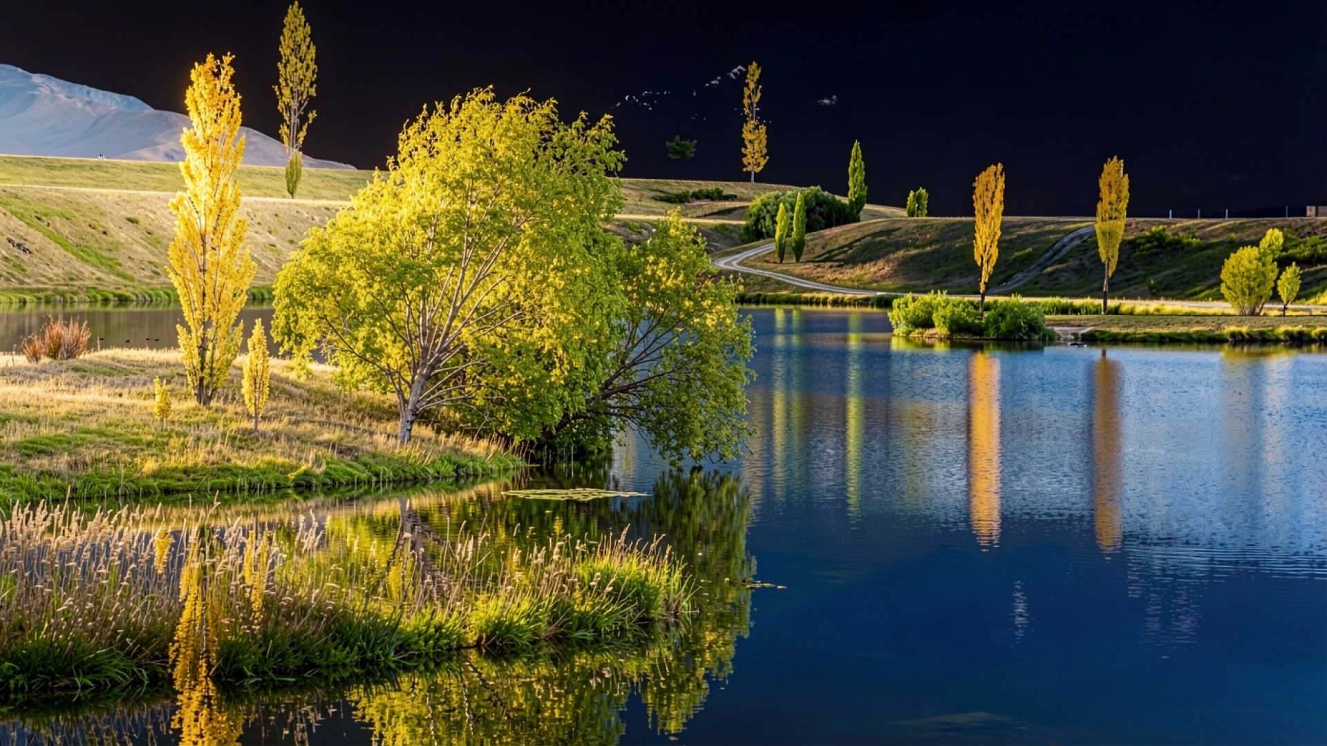 Изображение детально передает текстуру листвы и плавные градиенты водной глади. Контраст между насыщенным желтым цветом крон и глубоким синим тоном озера создает выразительный визуальный баланс. Мягкое освещение подчеркивает объем ветвей и четкость отражений в воде, а темный фон неба усиливает яркость переднего плана. На сайте доступен удобный предпросмотр перед скачиванием для оценки качества на экране.