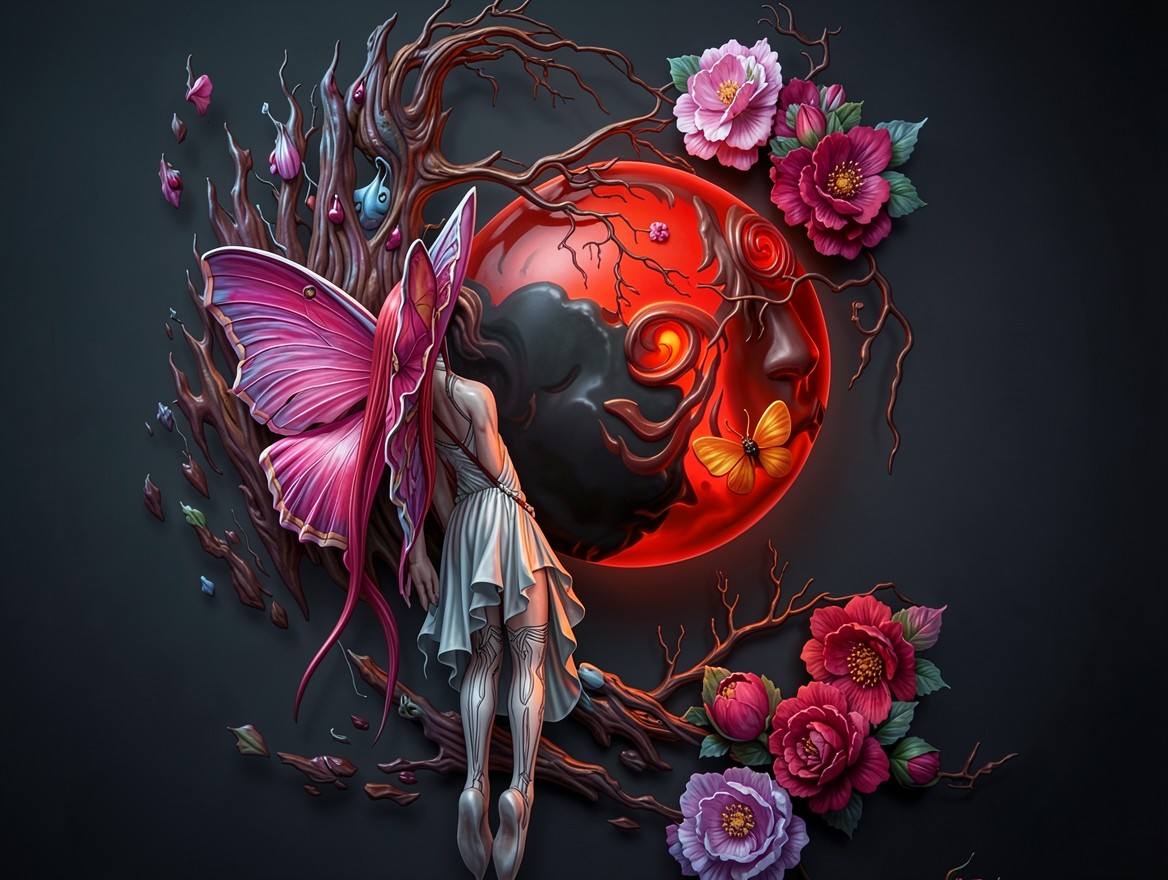 Композиция построена на взаимодействии органических форм: переплетенные ветви деревьев обрамляют центральную фигуру с крыльями бабочки. Цветовая палитра базируется на глубоком черном, кроваво-красном и неоновом розовом цветах. Технически изображение характеризуется высокой детализацией текстур кожи и лепестков цветов, что обеспечивает четкость при масштабировании до 4K. Согласно стандартам цветопередачи sRGB, которые описывает сайт adobe.com, такие насыщенные градиенты создают эффект объема и свечения объектов изнутри.
