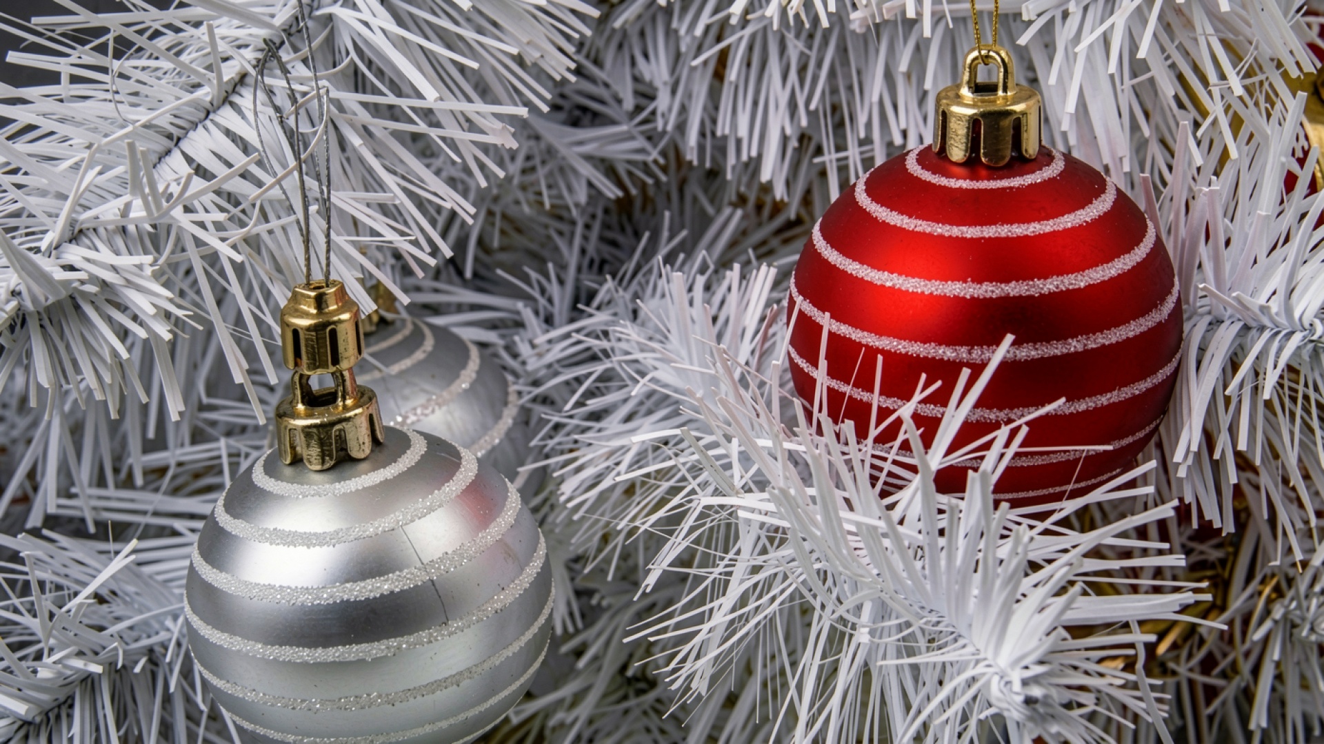 Изображение демонстрирует контраст матовых поверхностей шаров и глянцевых блестящих полос. Освещение создает мягкие блики на верхней части сфер, подчеркивая их объем и сферическую форму. Белые иглы ели создают сложную геометрическую сетку с глубокими тенями в местах пересечения ветвей. Градиенты фона плавно переходят от чистого белого к светло-серым тонам. Сайт предоставляет удобный предпросмотр перед загрузкой для оценки качества на экране.