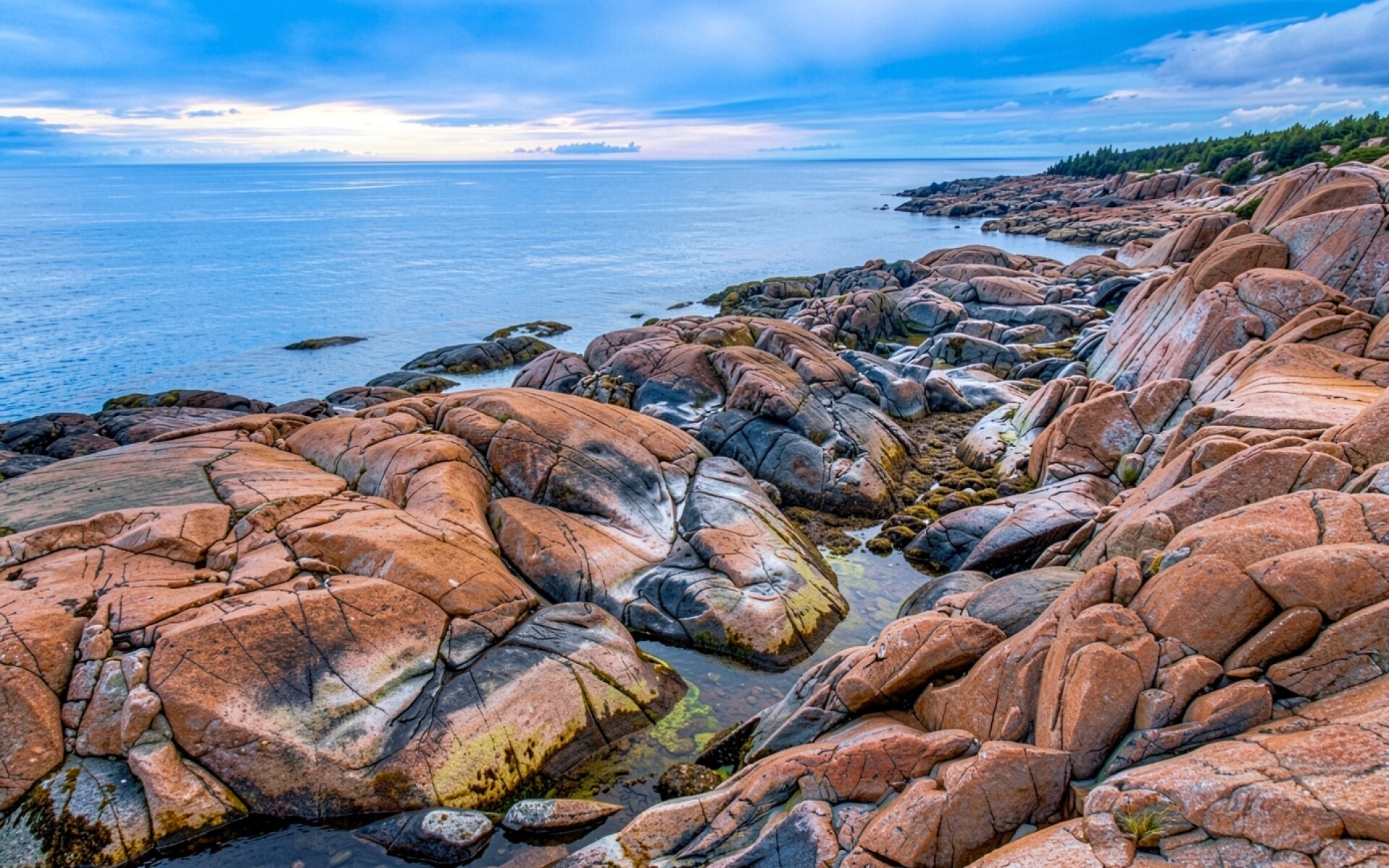 Согласно данным geology.com, рыжий цвет подобных прибрежных пород обусловлен окислением железосодержащих минералов, таких как ортоклаз, что придает граниту характерный красноватый оттенок. Нажмите кнопку скачивания, чтобы установить эти обои со скалами на ваш ПК или телефон прямо сейчас.