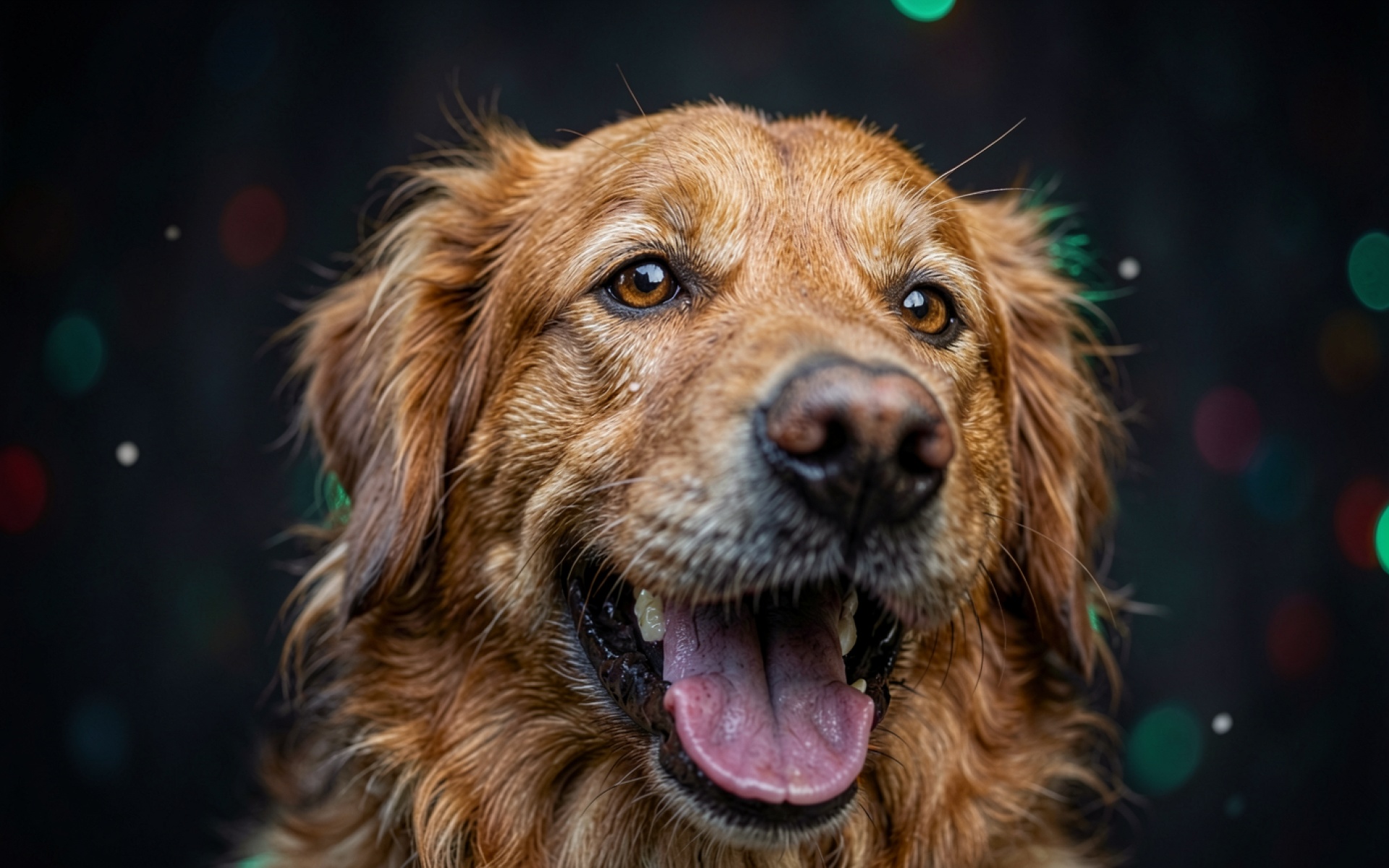 Данное изображение детально передает текстуру густой шерсти собаки, подчеркивая каждый волосок за счет направленного освещения. Контраст между теплыми рыжими оттенками морды и глубоким темным фоном создает объемный эффект. Мягкие блики в глазах и градиенты цветных световых пятен боке добавляют глубины композиции. На сайте доступен удобный предпросмотр перед загрузкой, чтобы оценить качество отображения на вашем экране.