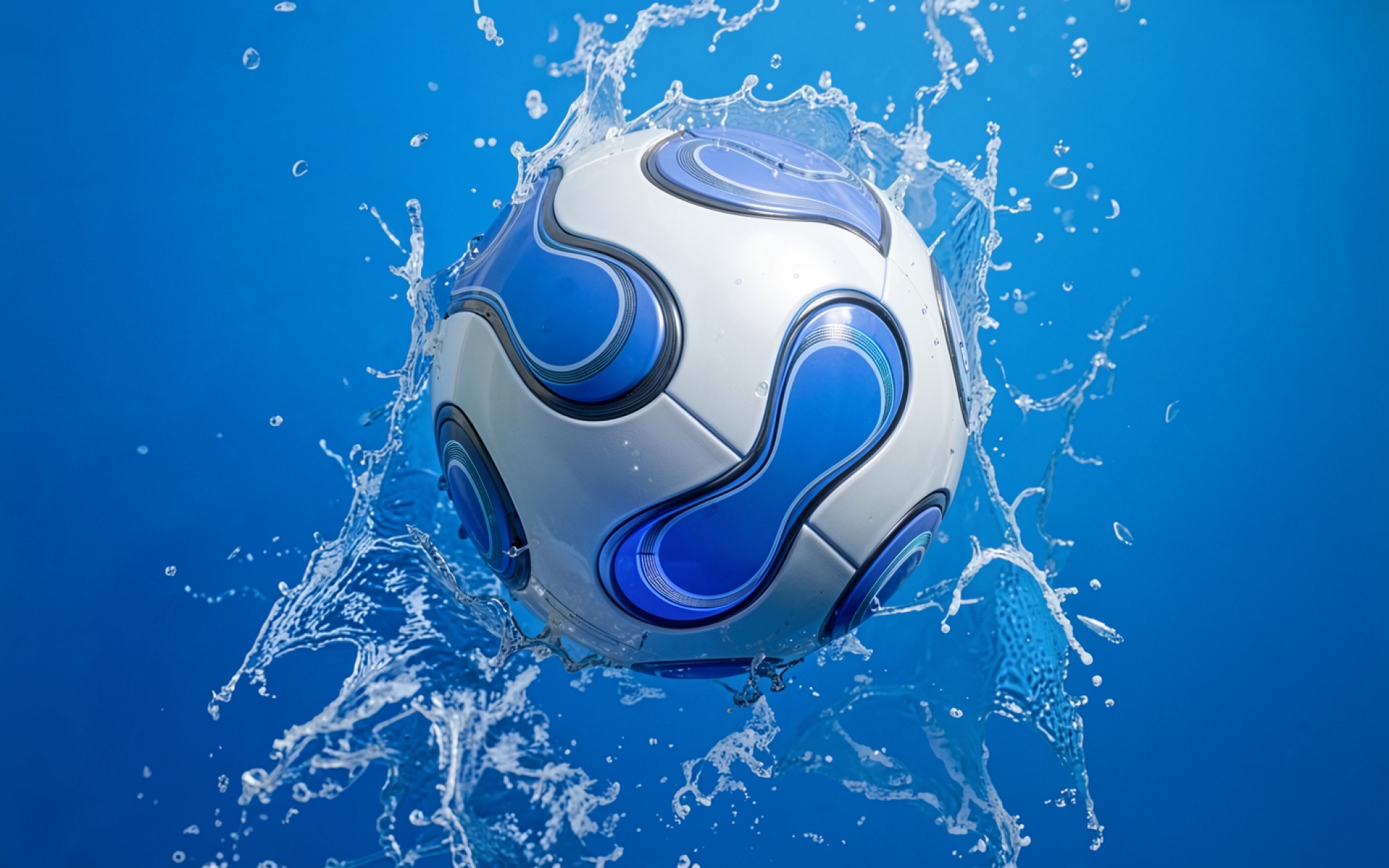 Изображение детально передает глянцевую текстуру панелей мяча и динамику водяных капель. Освещение создает четкие блики на изогнутых поверхностях, а градиенты синего фона подчеркивают объем центрального объекта. Контраст между белыми элементами кожи и насыщенным цветом воды создает глубокий визуальный эффект. На сайте доступен удобный предпросмотр перед скачиванием для оценки качества на экране.