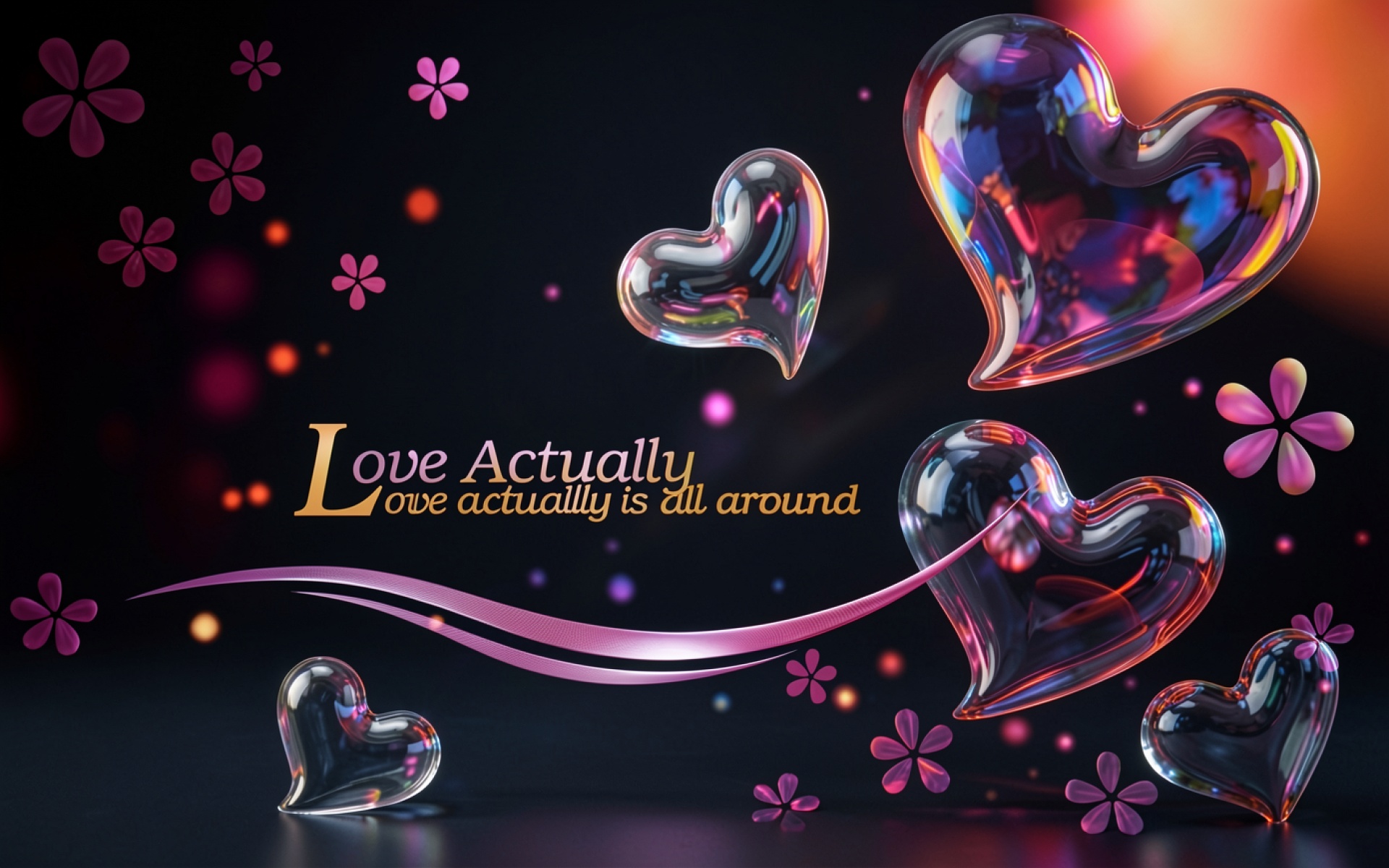 Стеклянные сердца с розовыми цветами на темном фоне обои