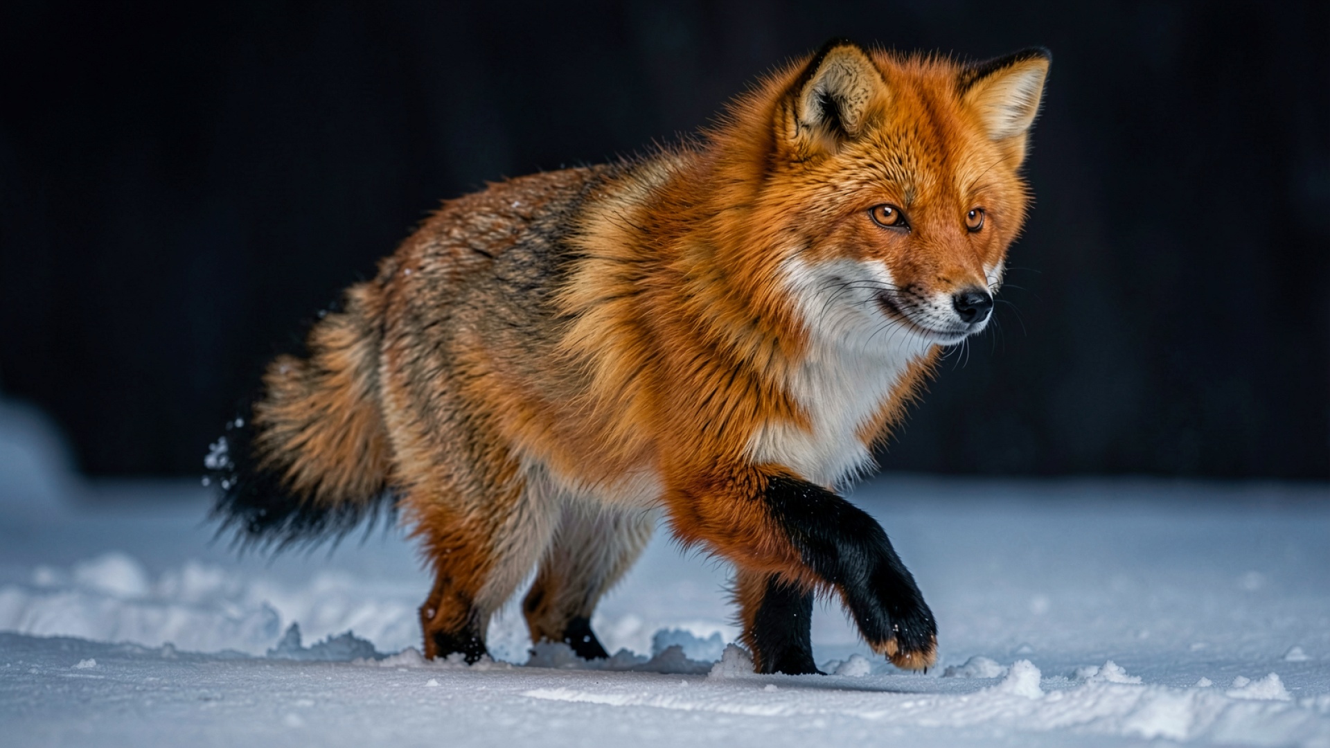 Композиция кадра построена на малом глубине резкости, что полностью изолирует объект от темного фона леса. Технические параметры изображения обеспечивают четкость каждой ворсинки шерсти и бликов в глазах. Согласно данным nationalgeographic.com, зимний мех лисиц обладает повышенной теплоизоляцией за счет плотного подшерстка, что визуально отражено в объеме фигуры на фото. Цветовая гамма базируется на комплементарных цветах: синеватых оттенках снега и теплых тонах меха, создавая сбалансированный визуальный ряд.