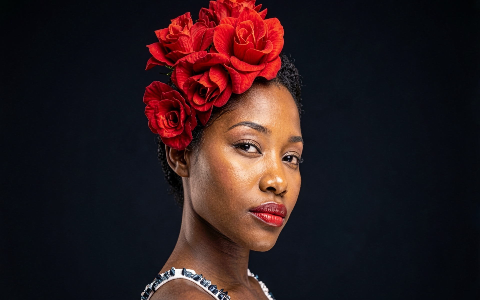 Доступны для скачивания JPG обои Портрет африканки с красными розами черный фон. Почему стоит скачать их? изображение прошло минимальное сжатие, что позволило сохранить все мелкие детали.