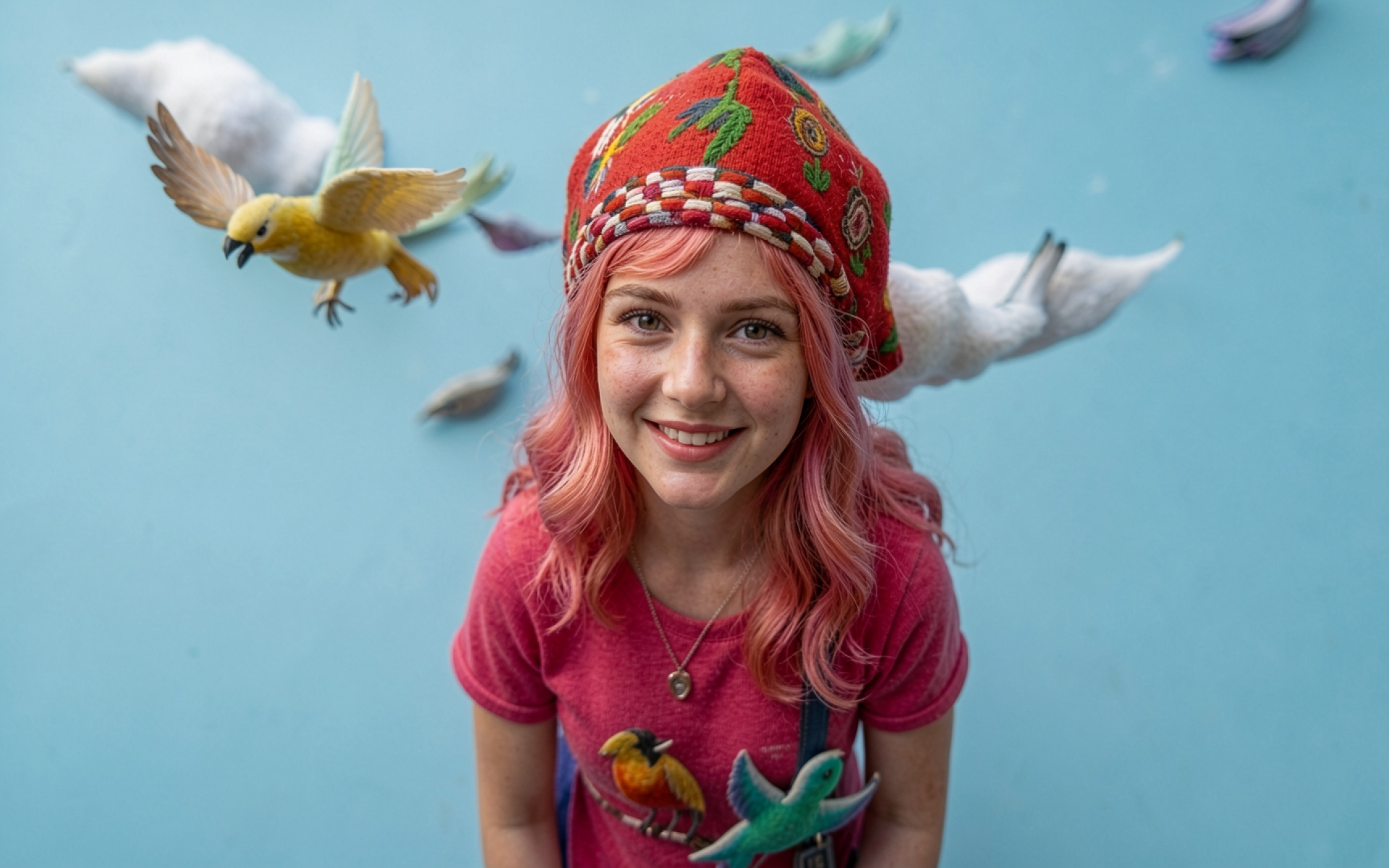 Изображение отличается детальной проработкой текстуры шерстяного колпака и мягких локонов. Освещение равномерно распределено по лицу, создавая естественные блики на коже и подчеркивая теплый оттенок розовых волос. Фон представляет собой однотонный голубой градиент с плавными переходами, что создает контраст с насыщенным красным цветом головного убора. На сайте доступен удобный предпросмотр перед скачиванием для оценки качества на экране.