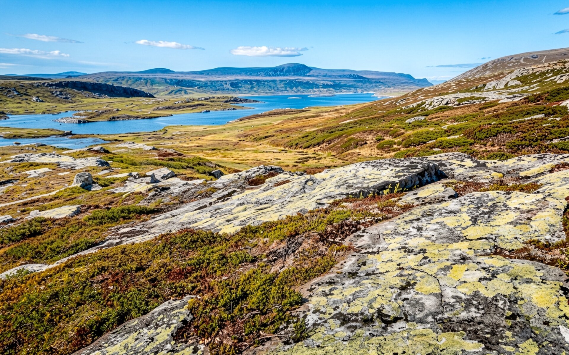 Техническое исполнение файла подчеркивает текстуру скальных пород и неоднородность лишайников на переднем плане. Освещение имитирует прямой полуденный свет, создавая четкие границы между освещенными участками камней и глубокими тенями в расщелинах. Градиент синего неба плавно переходит к горизонту, а зеркальная поверхность воды отражает окружающий рельеф. Перед загрузкой доступен удобный предпросмотр для оценки качества отображения на вашем экране.