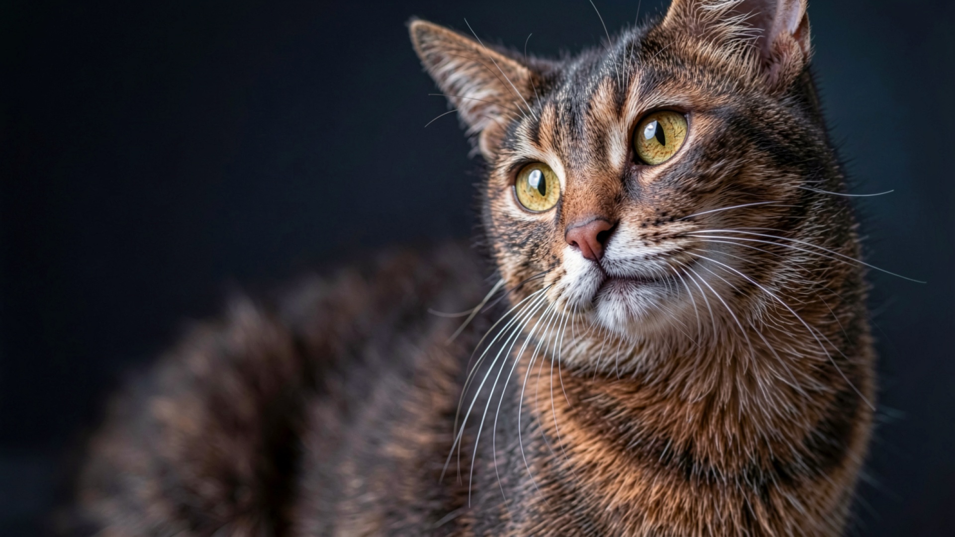 Доступны для скачивания JPG обои 'Полосатый кот в темном студийном интерьере'. Почему стоит скачать их? Только здесь представлена оригинальная компрессия с минимальными потерями