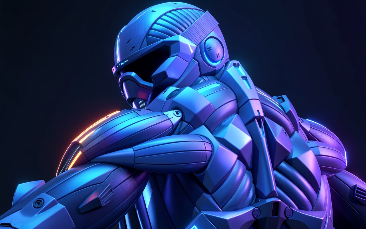 Визуальная концепция базируется на эстетике хард-серфейс моделирования с акцентом на анатомическую точность экзоскелета. Цветовая палитра сочетает ультрамарин и кобальт, что характерно для современного цифрового искусства в стиле киберпанк. Согласно стандартам цветопередачи sRGB, такие насыщенные темные тона обеспечивают высокую контрастность. Детализация брони с четкими фасками и градиентным освещением напоминает высокополигональные модели из современных AAA-проектов.