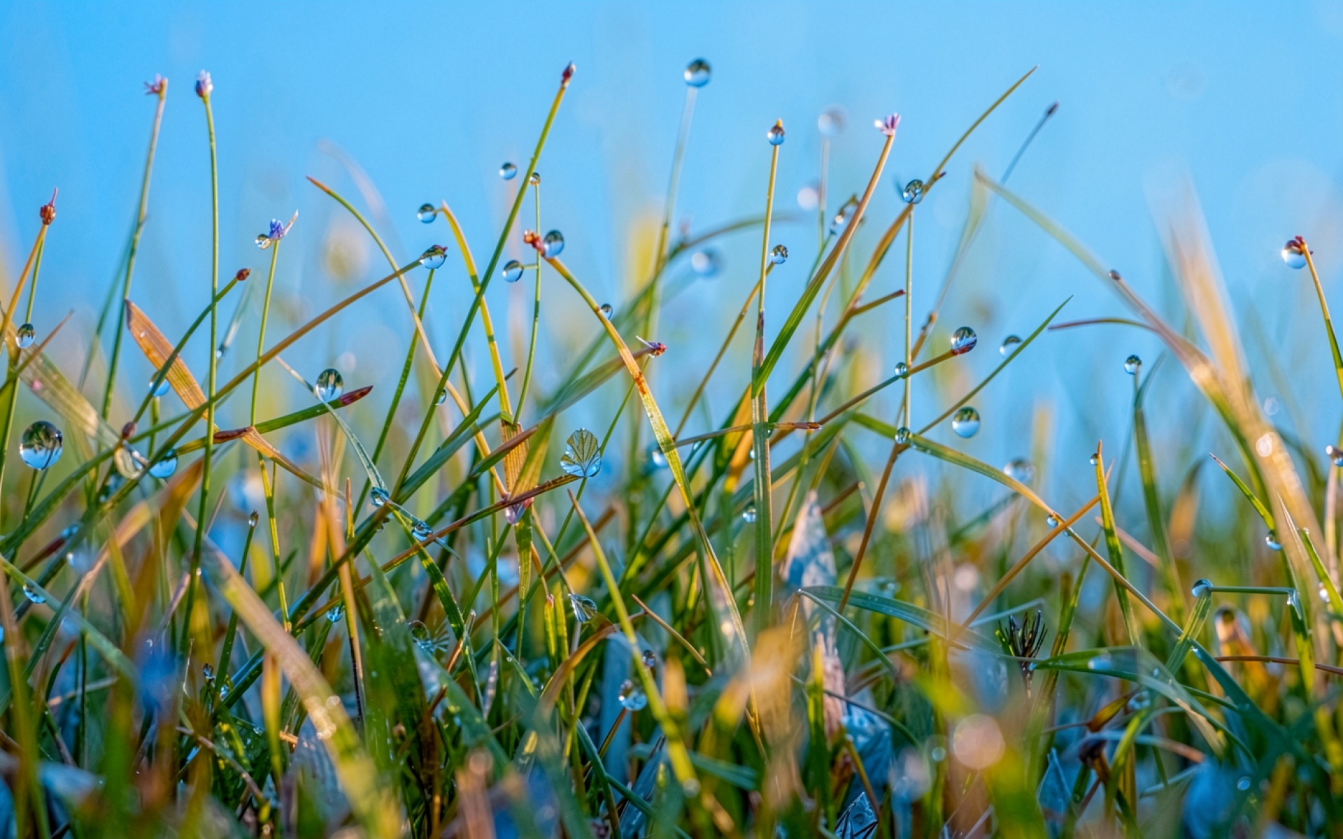 Изображение детально передает сферическую форму каждой капли, которые работают как линзы, преломляя утренний свет. Текстура стеблей травы сочетает в себе насыщенные зеленые и золотистые переходы, создавая естественный градиент на фоне чистого голубого неба. Мягкие блики на поверхности воды подчеркивают объем каждой частицы, а глубокие тени у основания растений добавляют сцене реализма. Перед загрузкой доступен удобный предпросмотр для оценки качества отображения на вашем экране.