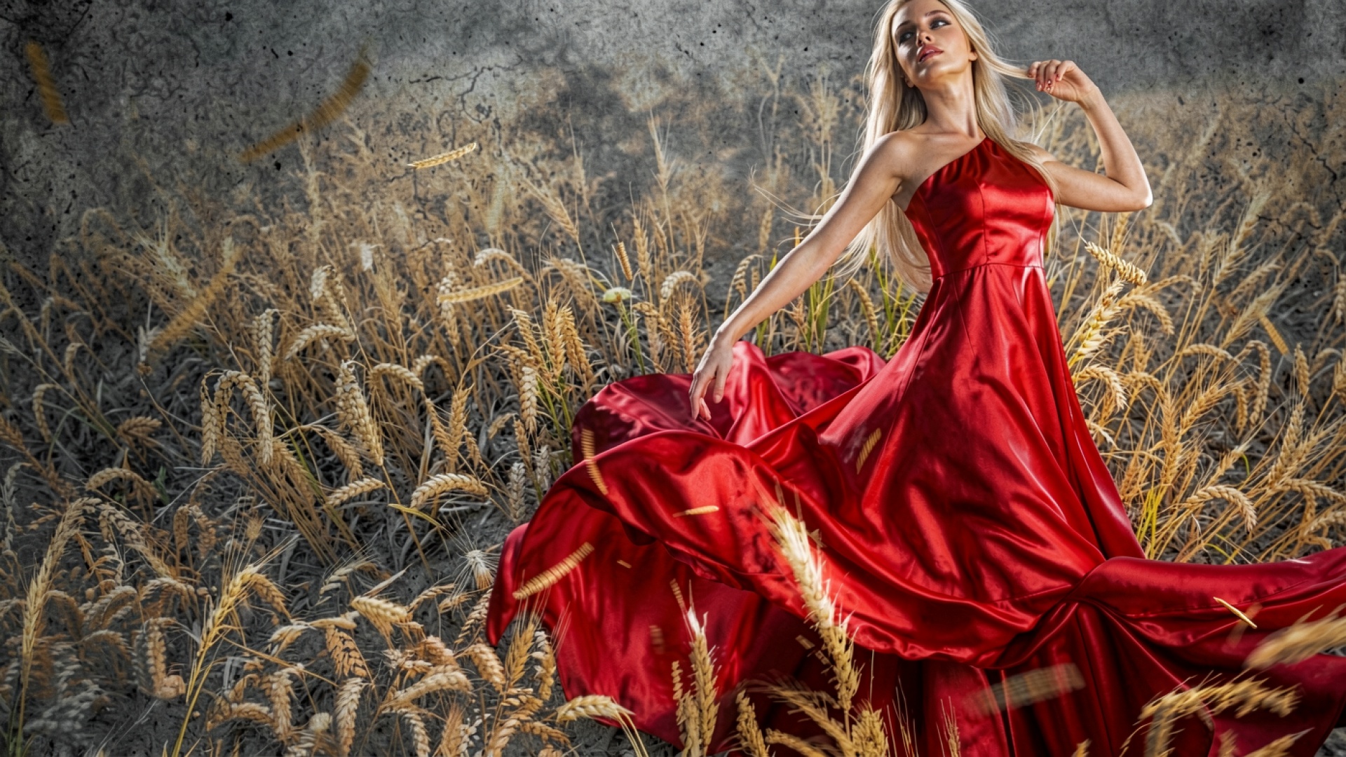 Девушка в красном платье в пшеничном поле обои
