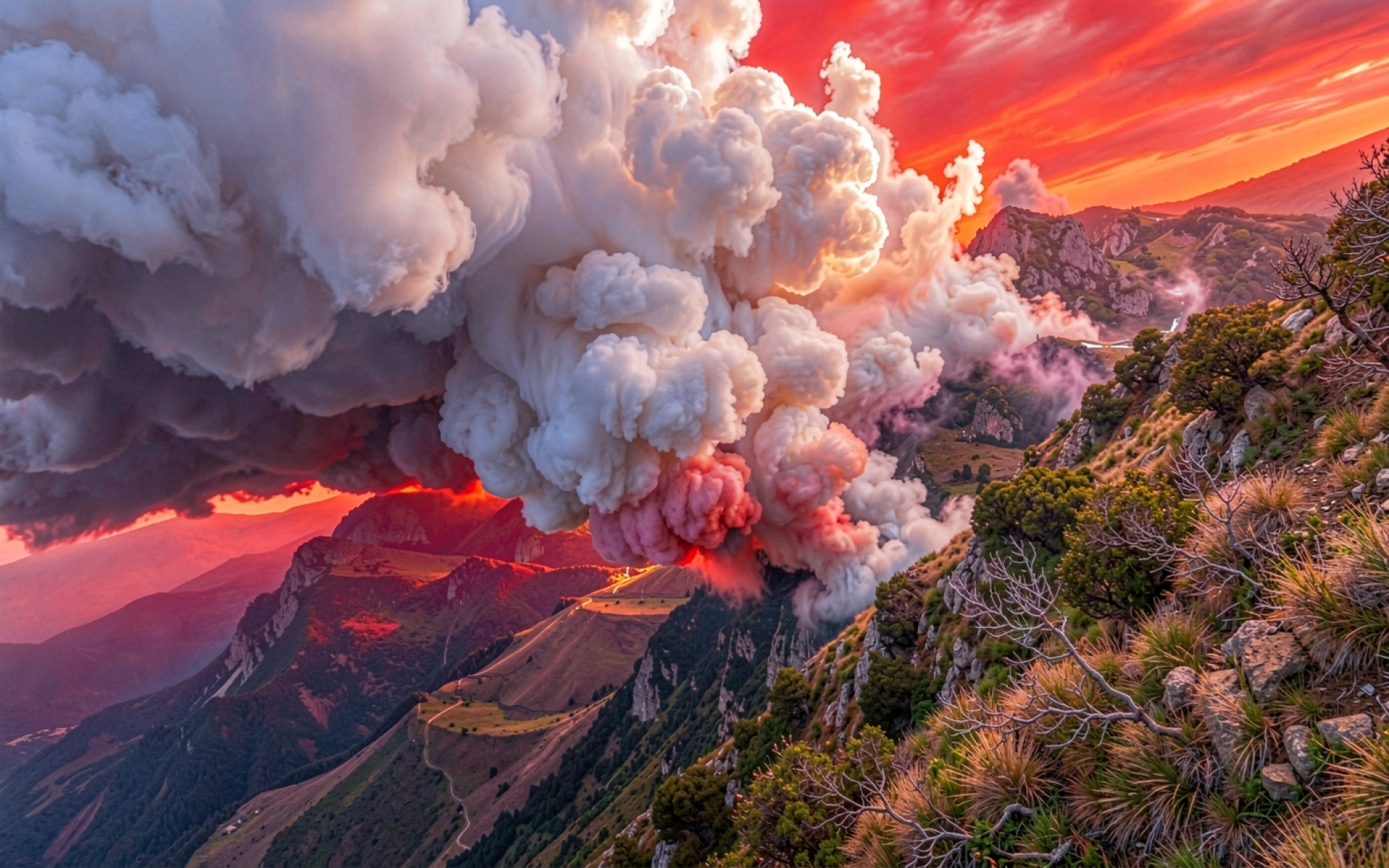 Изображение детально передает плотность пепельного облака, создавая выразительный контраст между светлыми вершинами дыма и глубокими тенями в складках горного рельефа. Градиенты красного неба плавно переходят в темные тона у подножия склонов, подчеркивая объем каждой скалы и текстуру сухой растительности на переднем плане. Сайт предоставляет удобный предпросмотр перед загрузкой, чтобы оценить качество цветопередачи на вашем экране.