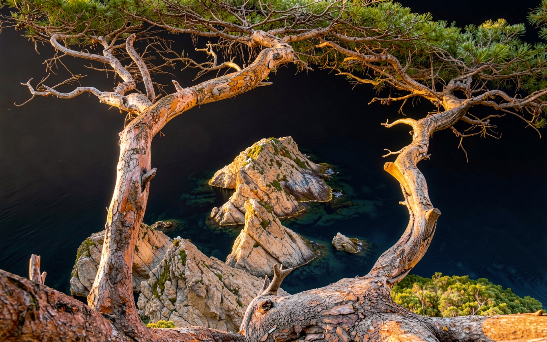 Изображение детально передает грубую текстуру коры дерева и острые грани прибрежных камней. Освещение имитирует золотой час, создавая теплые блики на стволах и глубокие контрастные тени в расщелинах скал. Плавные градиенты синего цвета в морской воде подчеркивают объем композиции. На сайте доступен удобный предпросмотр перед загрузкой для оценки качества отображения на вашем экране.