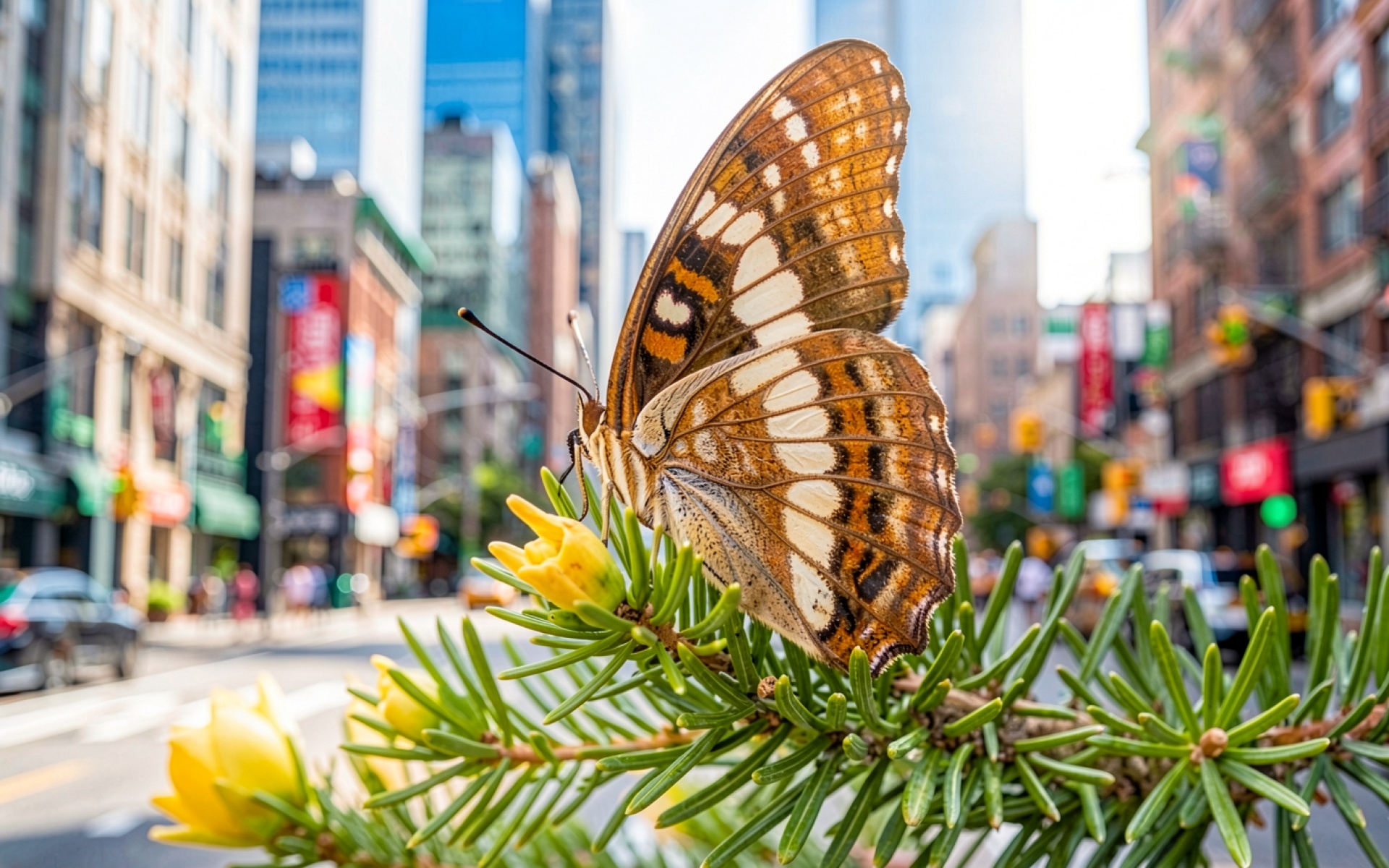 Скачайте JPG файл обоев Рыжая бабочка на зеленой хвое в городе на нашем сайте – и вот причина: только этот JPG сохраняет метаданные цветокоррекции.