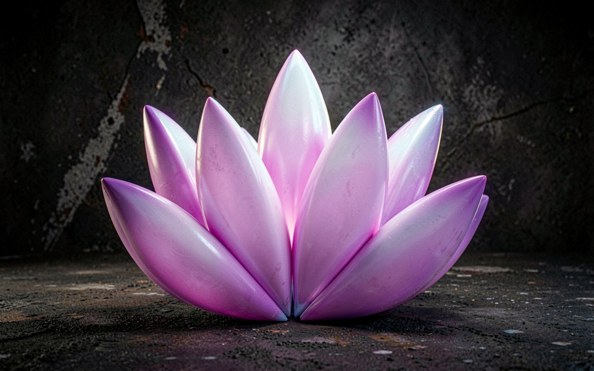 Изображение характеризуется контрастом между гладкой глянцевой поверхностью лепестков и грубой текстурой бетона. Мягкий свет создает плавные градиенты розового цвета, подчеркивая объем каждой детали цветка. Акценты расположены на верхних кромках лепестков, в то время как глубокие тени в основании создают эффект устойчивости объекта в пространстве. На сайте доступен удобный предпросмотр перед скачиванием для оценки качества на экране.