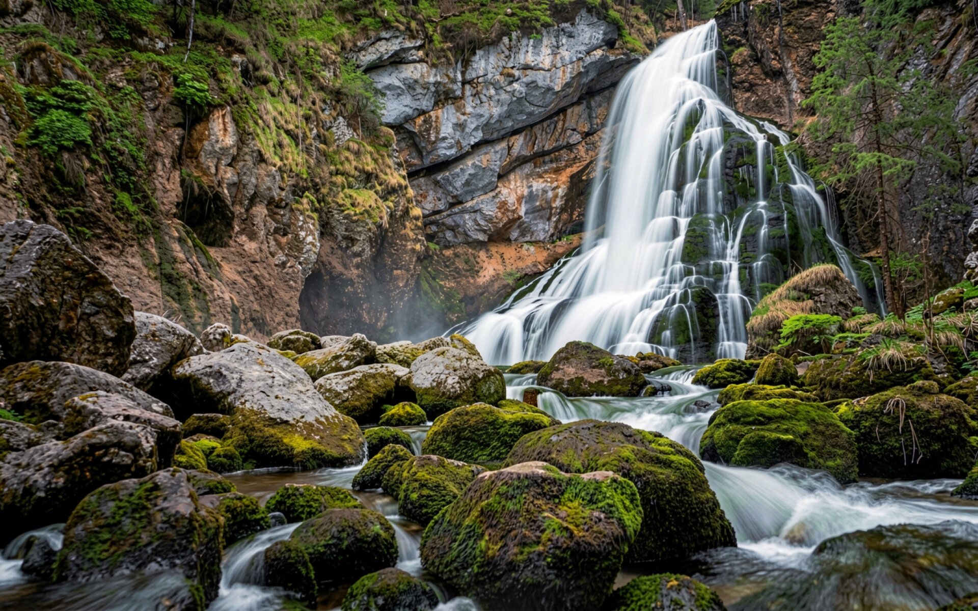 Изображение детально передает текстуру влажного камня и мягкий ворс зеленого мха. Освещение распределено равномерно, создавая плавные градиенты в затененных участках скал и яркие блики на струях падающей воды. Контраст между темным основанием гор и белым потоком подчеркивает динамику сцены. На сайте доступен удобный предпросмотр перед загрузкой, чтобы оценить качество отображения на вашем экране.