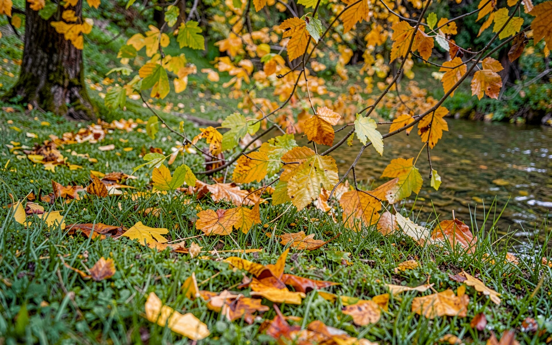 Загрузка JPG обоев Осенние желтые листья на берегу реки с нашего сайта необходима потому что полная цветопередача сохраняется без потери качества.