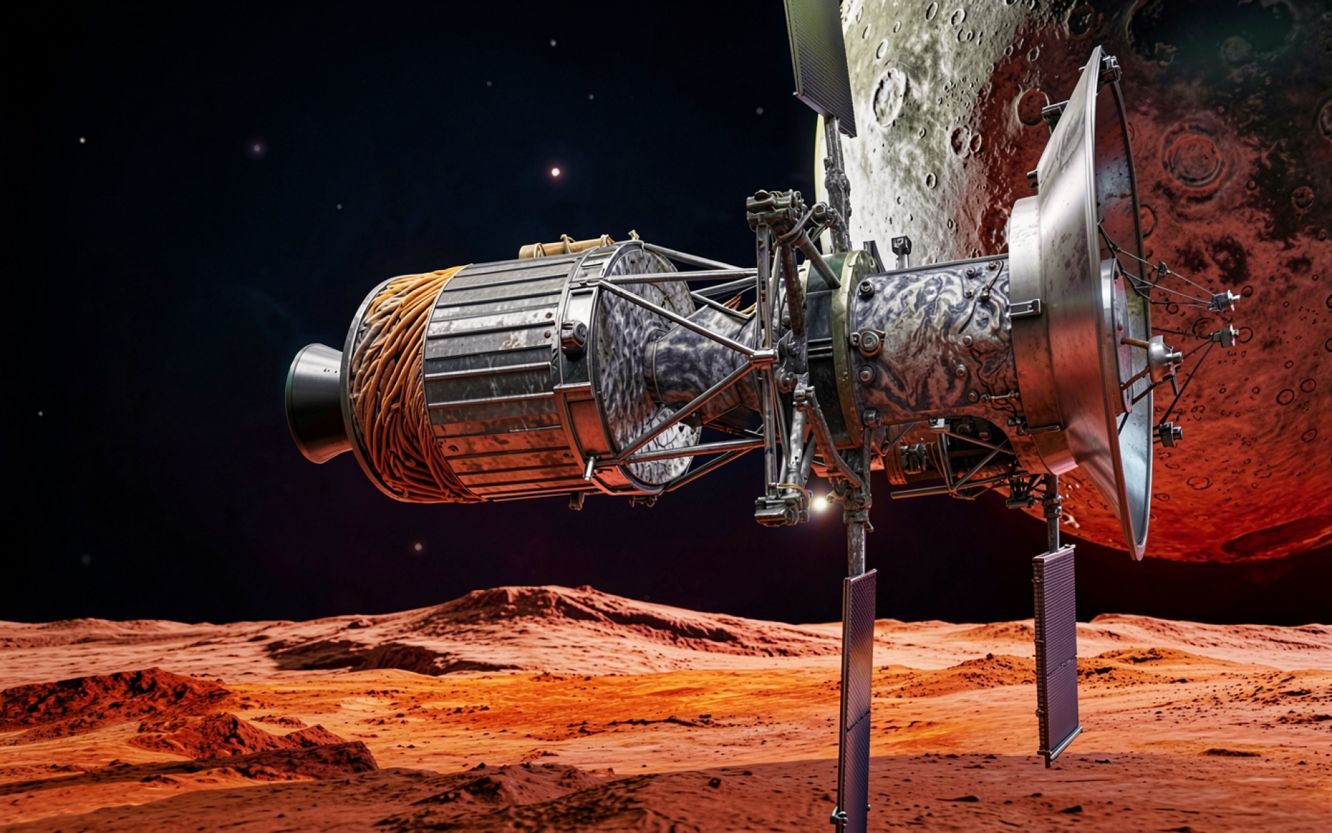 Изображение детально передает текстуру металлического корпуса аппарата с характерными отражениями от поверхности Марса. Освещение создает четкие контрасты между глубокими тенями в технических узлах и яркими бликами на антенне. Фон характеризуется плавным переходом цветов от насыщенного оранжевого грунта к черному вакууму космоса. Сайт предоставляет удобный предпросмотр перед загрузкой для оценки качества отображения на экране.