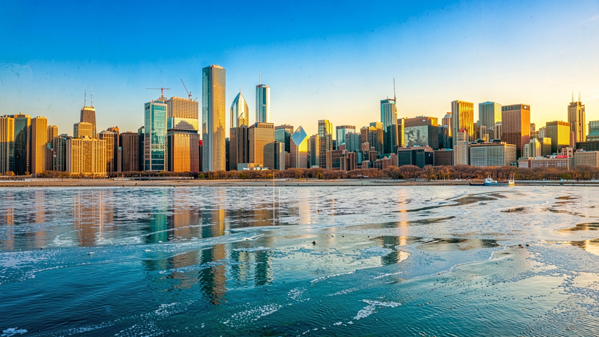 Горизонт Чикаго демонстрирует архитектурный контраст между стальными небоскребами и текстурой льда озера Мичиган. Освещение в золотой час подчеркивает геометрию зданий, создавая глубокие тени и яркие блики на стеклянных фасадах. Согласно данным Britannica.com, Чикаго является одним из мировых центров современной архитектуры, что отражено в разнообразии форм высотных строений на снимке. Технически изображение характеризуется высокой детализацией переднего плана с выраженными кристаллическими структурами льда и четким разделением цветовых зон: от глубокого синего неба до теплых охристых оттенков городской застройки.