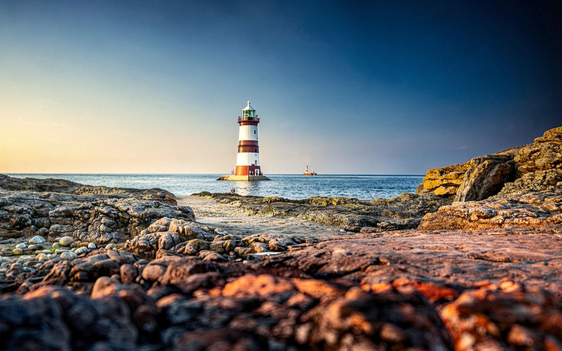 Изображение детально передает шероховатую текстуру прибрежных камней и глянцевую поверхность воды. Контрастные красные полосы маяка выделяются на фоне градиента неба от золотистого к глубокому синему. Мягкое освещение подчеркивает объем архитектурных форм и создает плавные переходы в тенях скал. На сайте предусмотрен удобный предпросмотр перед загрузкой для оценки качества на экране.