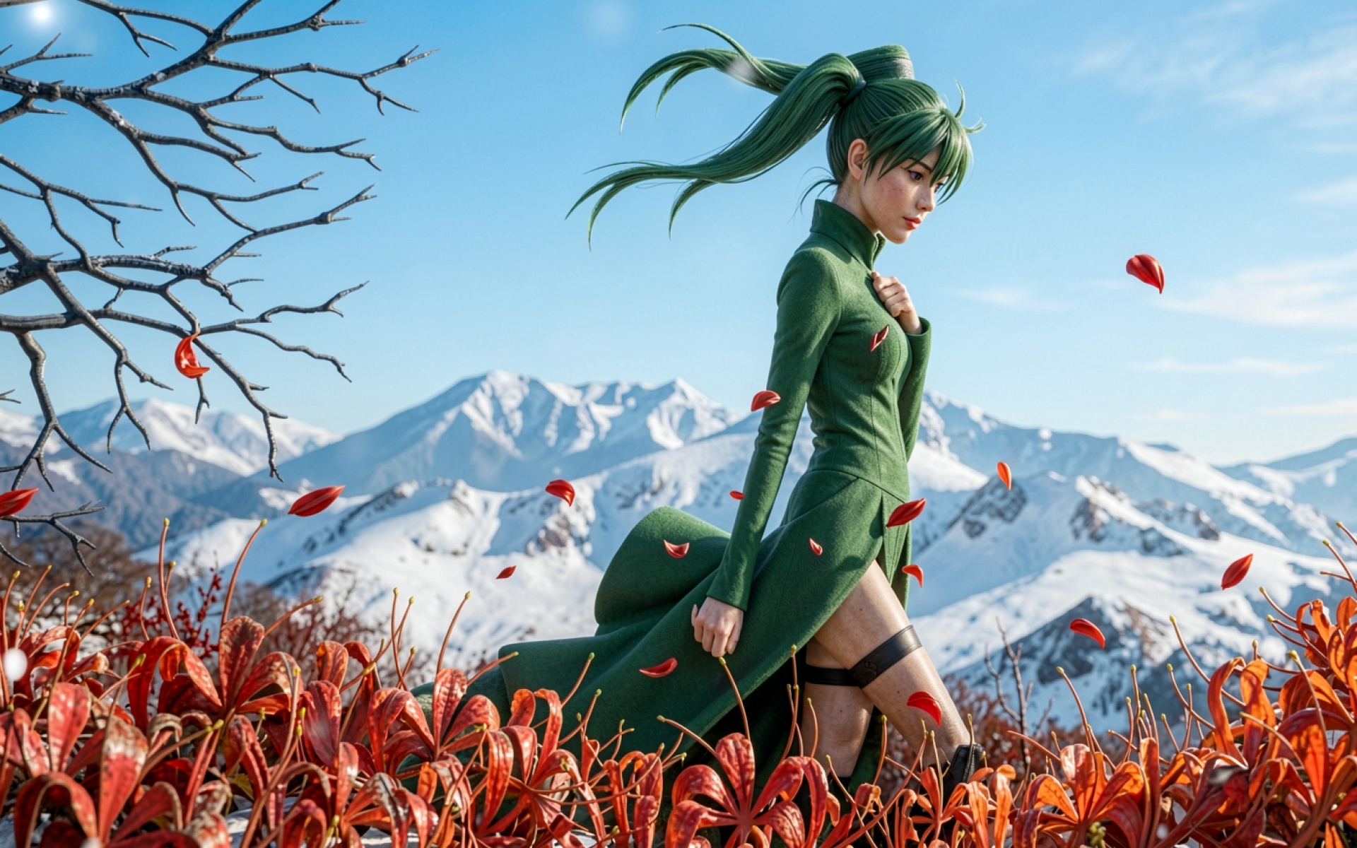 Изображение характеризуется высокой детализацией текстуры ткани платья и органических форм лепестков. Освещение создает мягкие переходы между ярко-зеленым цветом наряда и насыщенным красным фоном растительности. Градиенты неба плавно переходят от голубого к светлому горизонту, подчеркивая контраст с заснеженными вершинами гор. На сайте доступен удобный предпросмотр перед скачиванием для оценки качества на экране.