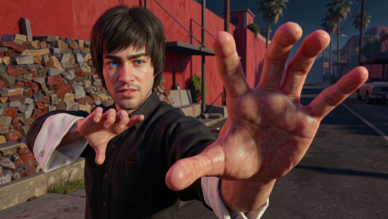 Изображение отличается детальной проработкой текстуры ткани черной рубашки и кожи рук. Освещение создает четкие блики на лице и пальцах, подчеркивая объем. Контраст между темной одеждой и насыщенным красным градиентом стены создает глубокую визуальную динамику. На сайте доступен удобный предпросмотр перед скачиванием для оценки качества на экране.